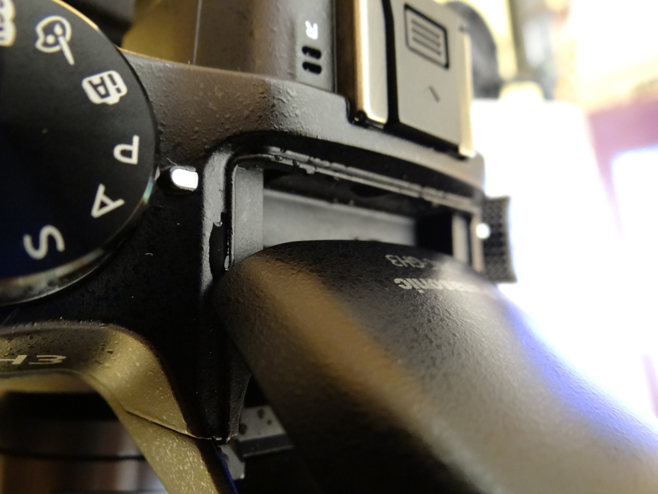 ホットシューカバーをはずしたら水が溜まっていた。ここによるとカバーはホットシューの防錆コーティング保護のために必要であって、防滴性能には関係ないらしい。 - ステレオマイク
