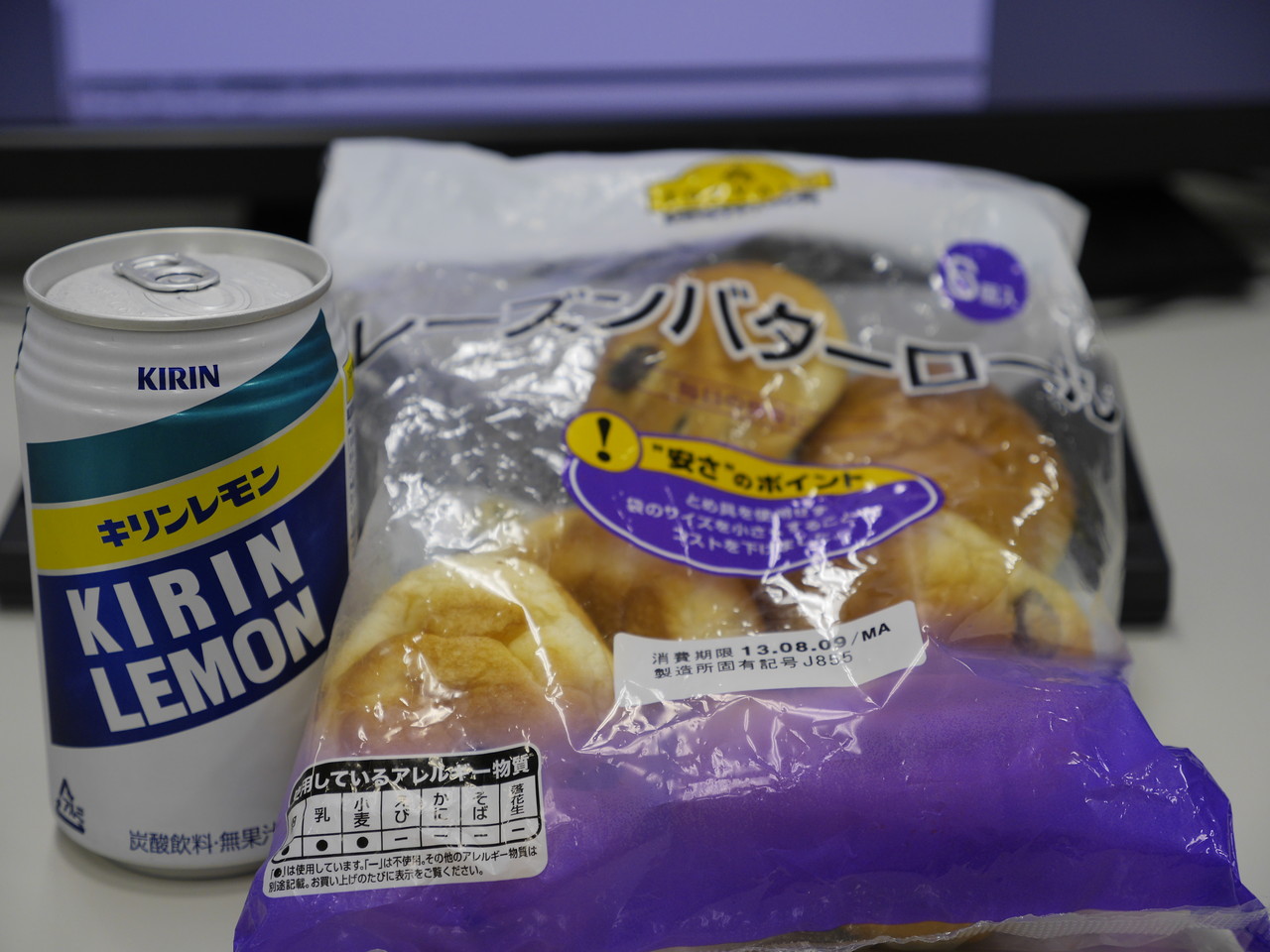 練習後の補食: ペプチド数グラム、キリンレモン(「1973年に発売したキリンレモンをもとにデザインしました」)、レーズンバターロール(84kcal)4個。