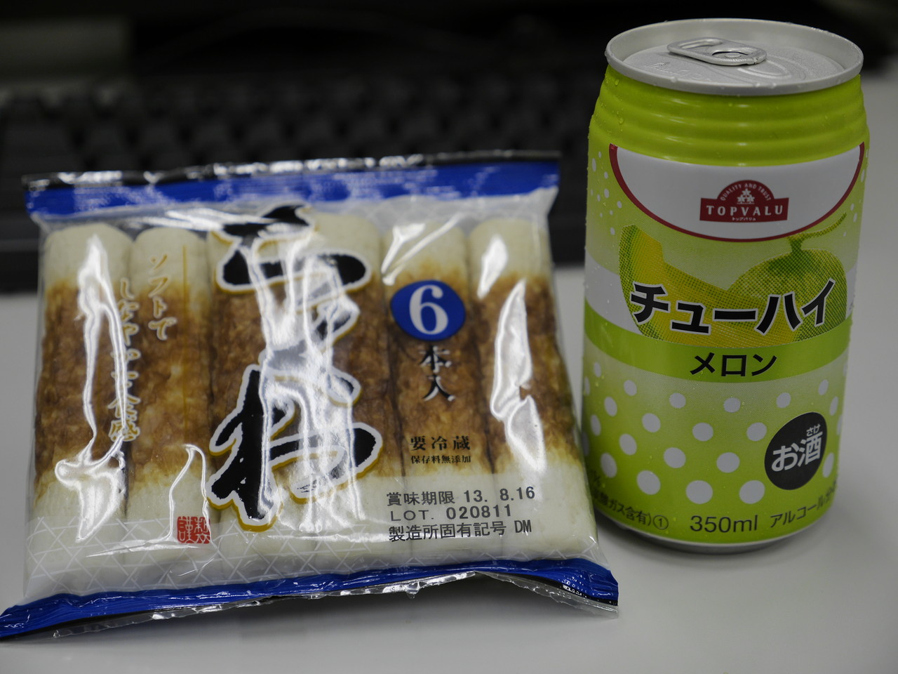 練習後の補食: ペプチド数グラム、topvalueメロンチューハイ(202kcal,たんぱく質0,脂質0,炭水化物27.7g)、松久土井 焼きちくわ(84kcal,たんぱく質8.7g,脂質0.2g,炭水化物12.3g @100g)。1本あたりタンパク質8.7gだとおもってたが、100gあたりで、しかも製品重量が書いてない。失敗した。ちなみにメロンチューハイは68円、ちくわは99円。
