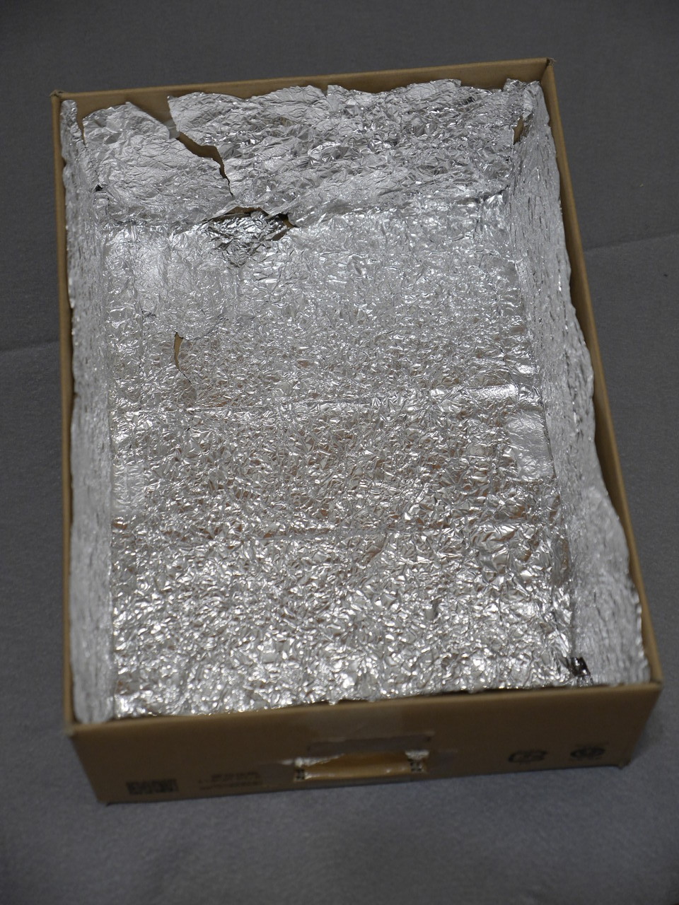 アマゾンの空き箱でソフトボックスをつくってみた。箱のサイズはたて32cmよこ24cmふかさ11cm。内側にしわしわにしたアルミフォイルをはりつけて、箱側面にフラッシュを突っ込む穴を開けて、おもてには百均でかった白乳色のテーブルクロスを貼り付けた。写真はテーブルクロスを貼る前。