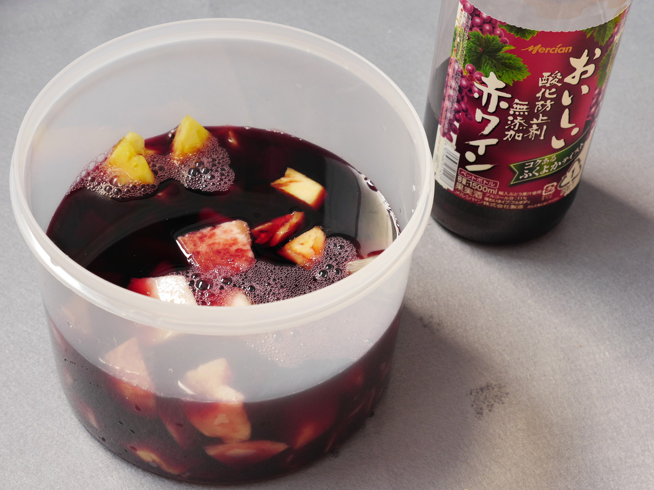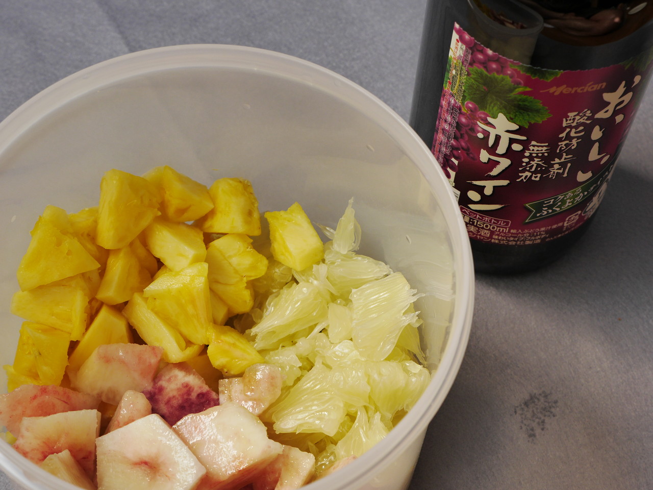 果物はタッパーに入れてメルシャンの安ワインを1リットルほど注入。明日にはおいしくなってるかなぁ。