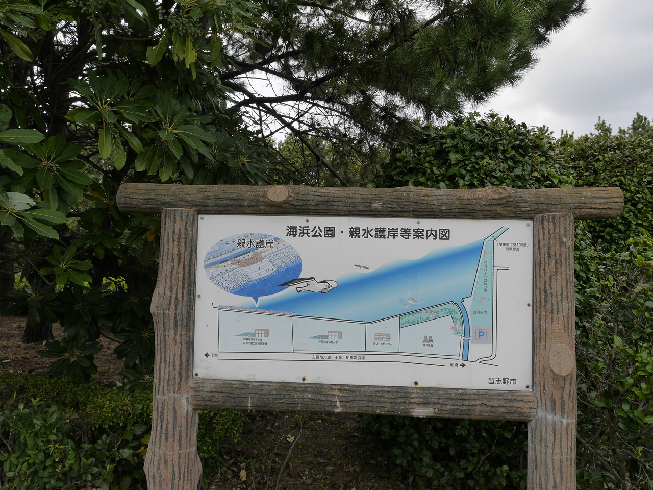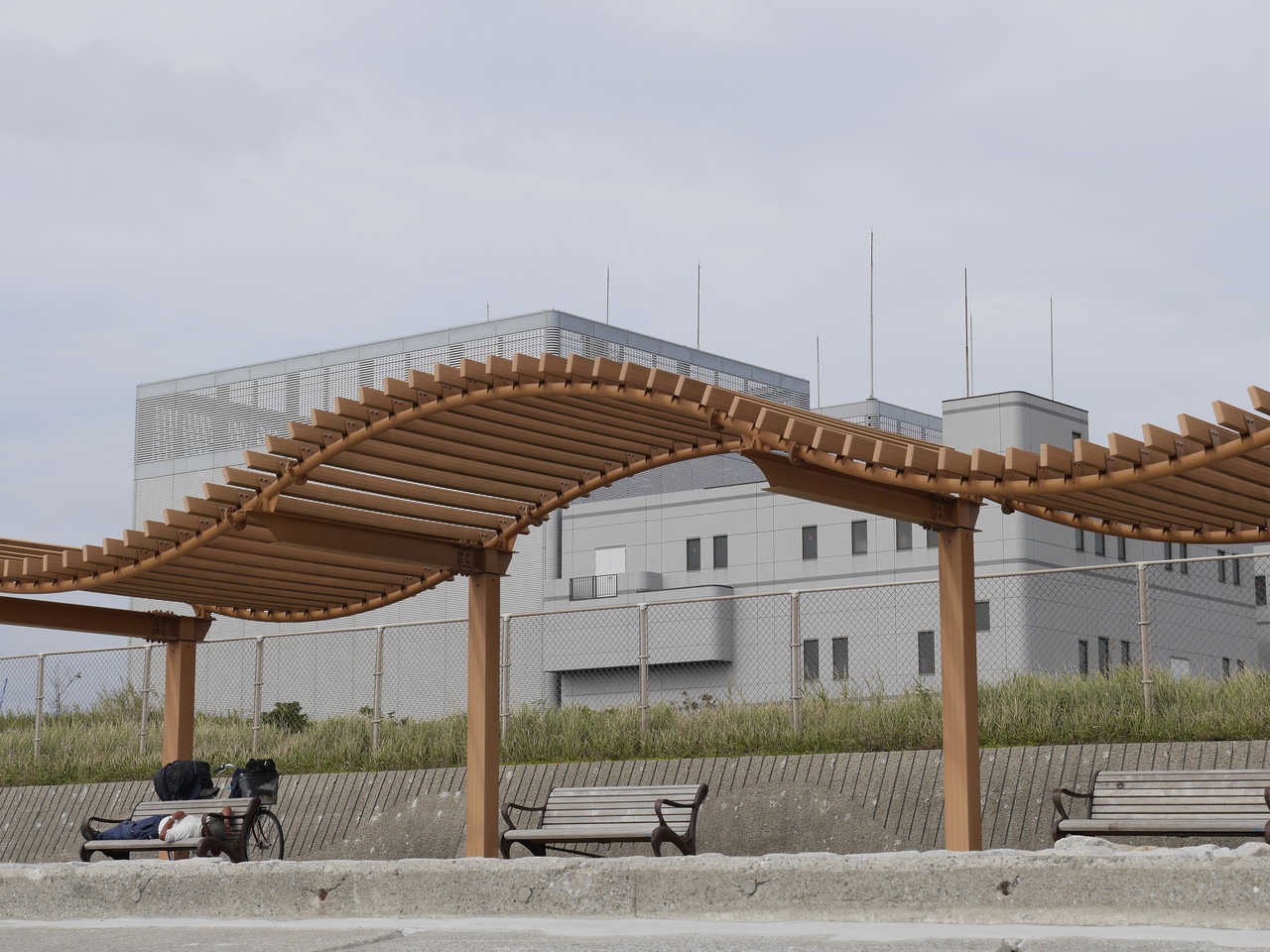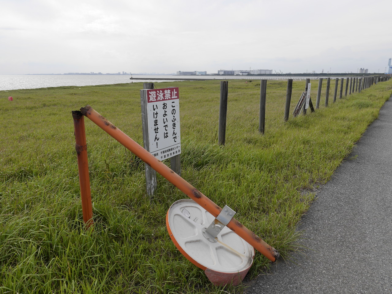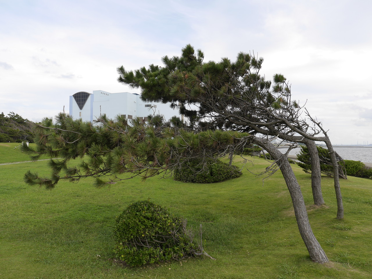 曇り空だが歩いていると汗だくに。海岸沿いは公園になっているが自販機などはなく、一カ所水飲み場があった。家族連れのほか、釣りしてる人とか日光浴してる人とか、それなりに人がいた。海からの風が強いので木は陸側に傾いていた。
