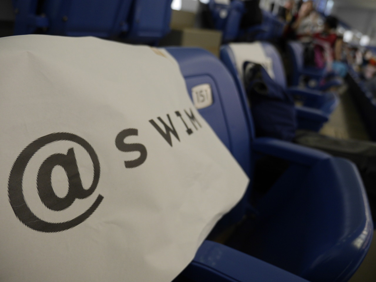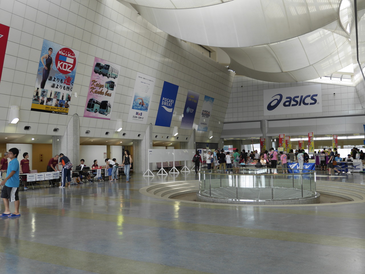 会場入口で@SWIMの出席チェックを受けて、すぐにプールでアップ。あき姉さんがカメラもってうろうろしてた。レースは開会式直後なので軽めにキック中心に動かして腕が疲れない方向で。スタート練習は省略。