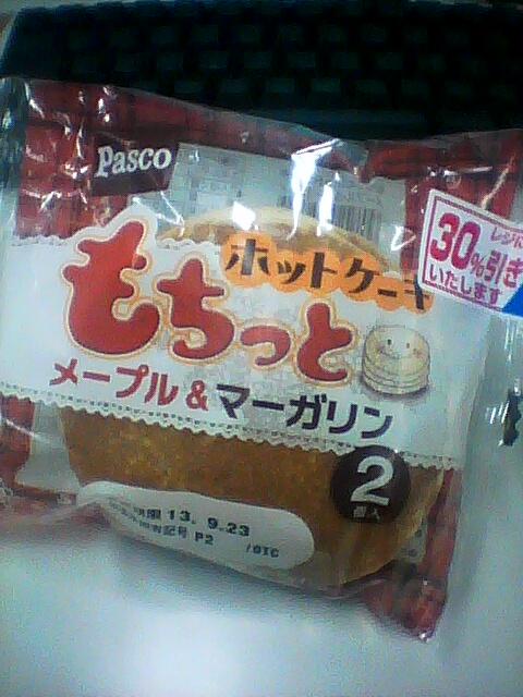 練習後の補食: ペプチド数グラム、Pasco もちっとホットケーキ メープル&マーガリン(390kcal,たんぱく質2.6g,脂質12.0g,炭水化物66.0g)。