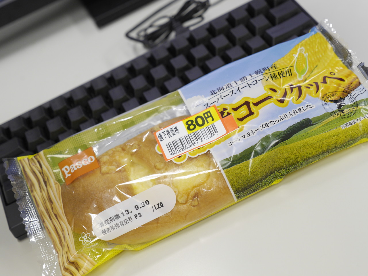 練習後の補食: ペプチド数グラム、Pasco 十勝産コーンクッペ(343kcal,たんぱく質7.4g,脂質18.3g,炭水化物37.3g)。