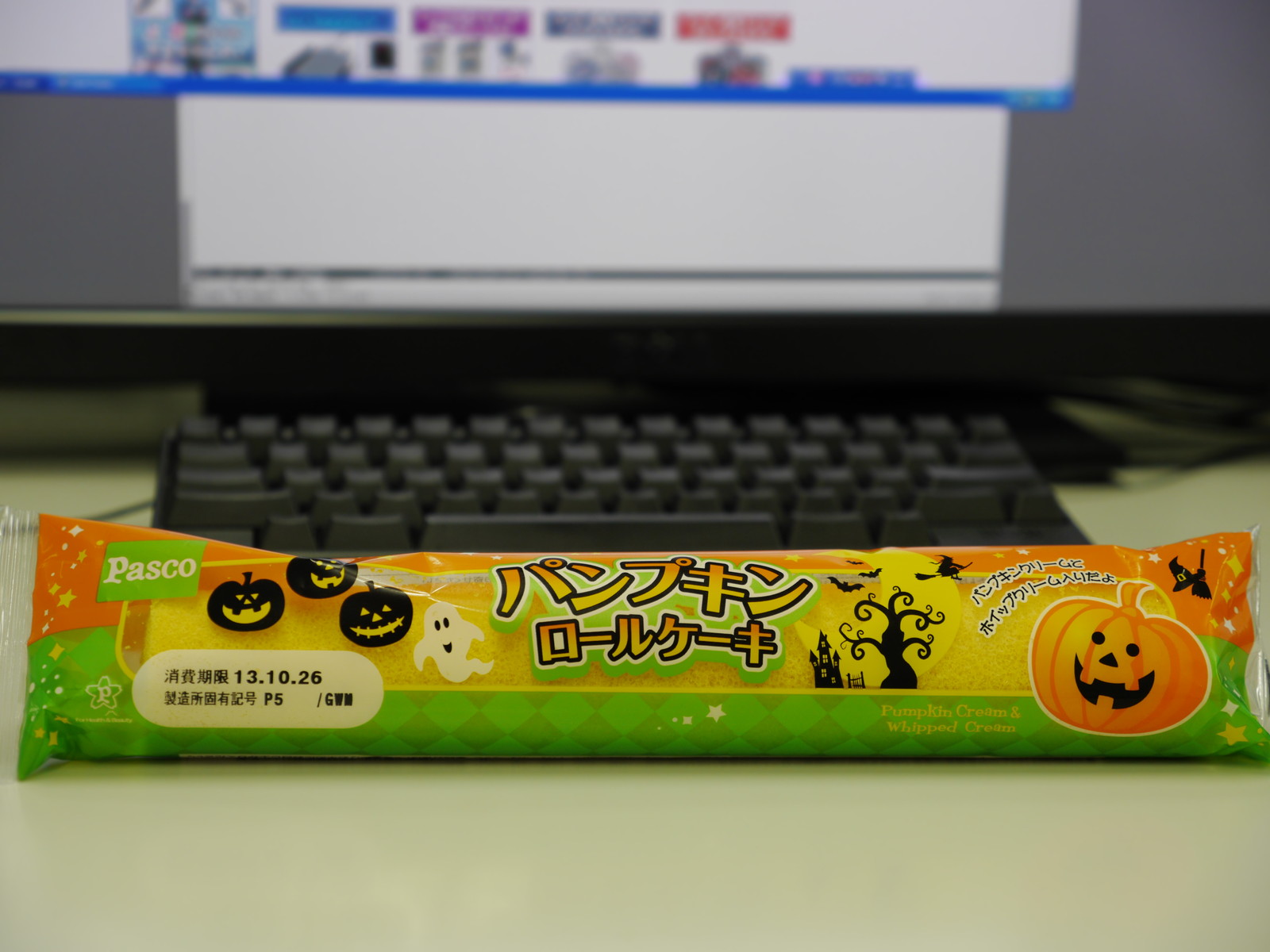 練習前の補食: Pasco パンプキンロールケーキ(376kcal,たん白質6.3g,脂質12.3g,炭水化物60.1g)。