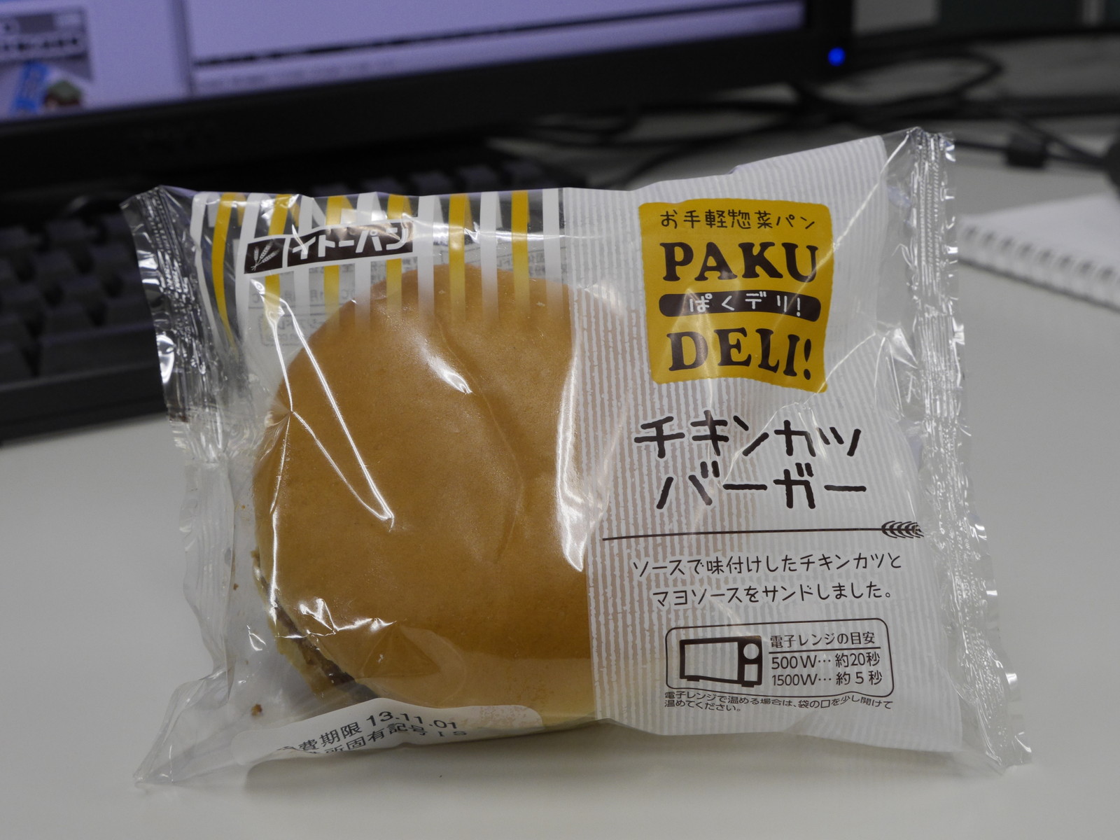 練習後の補食: ペプチド数グラム、イトーパン ぱくデリ!チキンカツバーガー(351kcal,たん白質9.1g,脂質20.7g,炭水化物32.1g)。