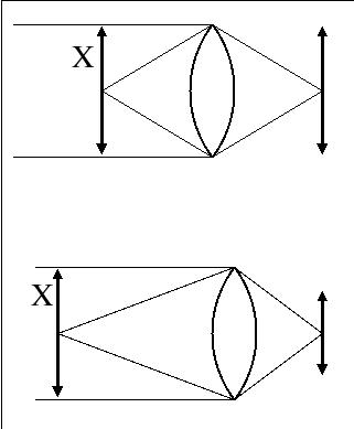 そのとき十分遠くに置いた点光源からの光はレンズにまっすぐ入ってきていて、ちょうどピントを合わせた物体Xの位置に有効口径と同じ直径の面光源を置いたのと同じように見えるはず。
