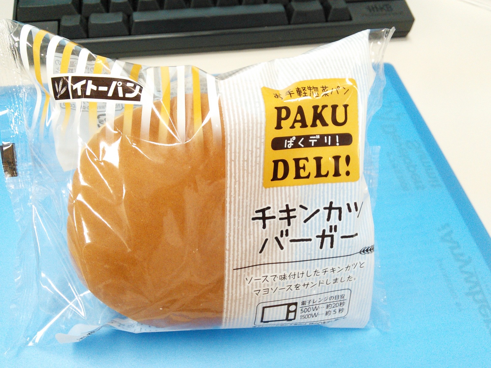 練習後の補食: ペプチド数グラム、イトーパン チキンカツバーガー(351kcal,たん白質9.1g,脂質20.7g,炭水化物32.1g)。