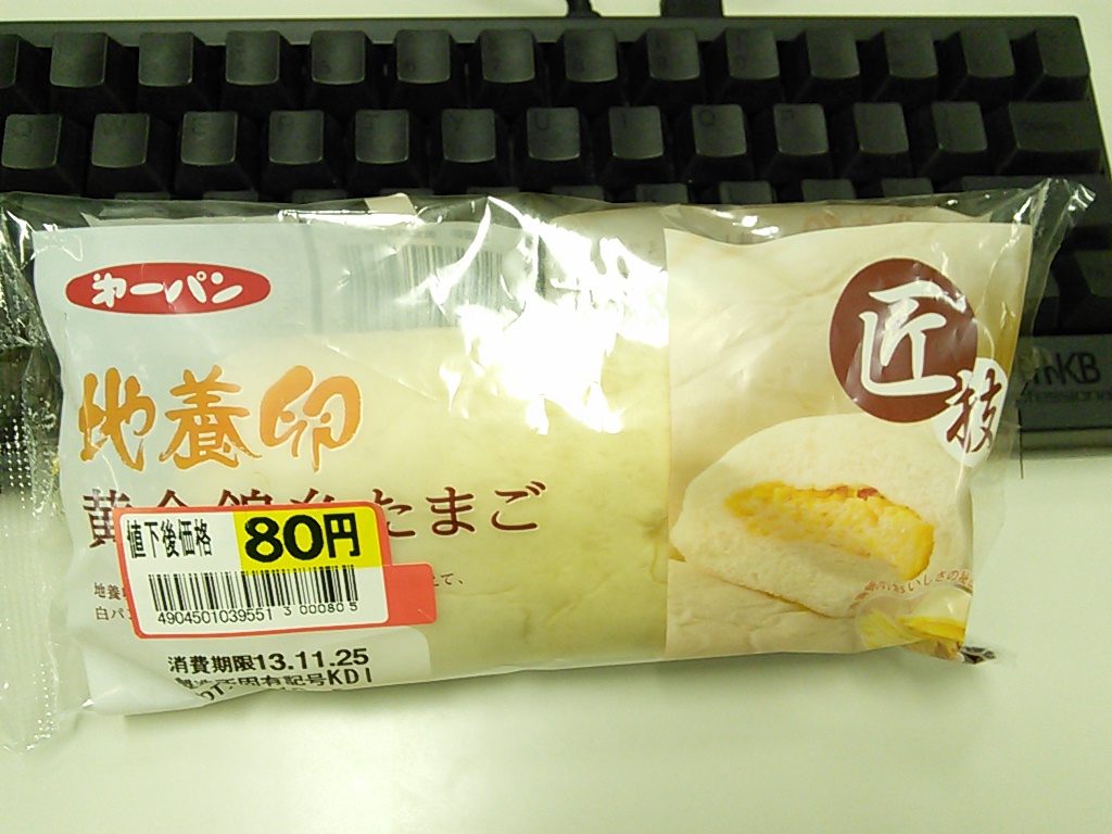 練習後の補食: ペプチド数グラム、第一パン 地養卵黄金綿糸たまご(310kcal,たん白質6.4g,脂質18.5g,炭水化物29.4g)。