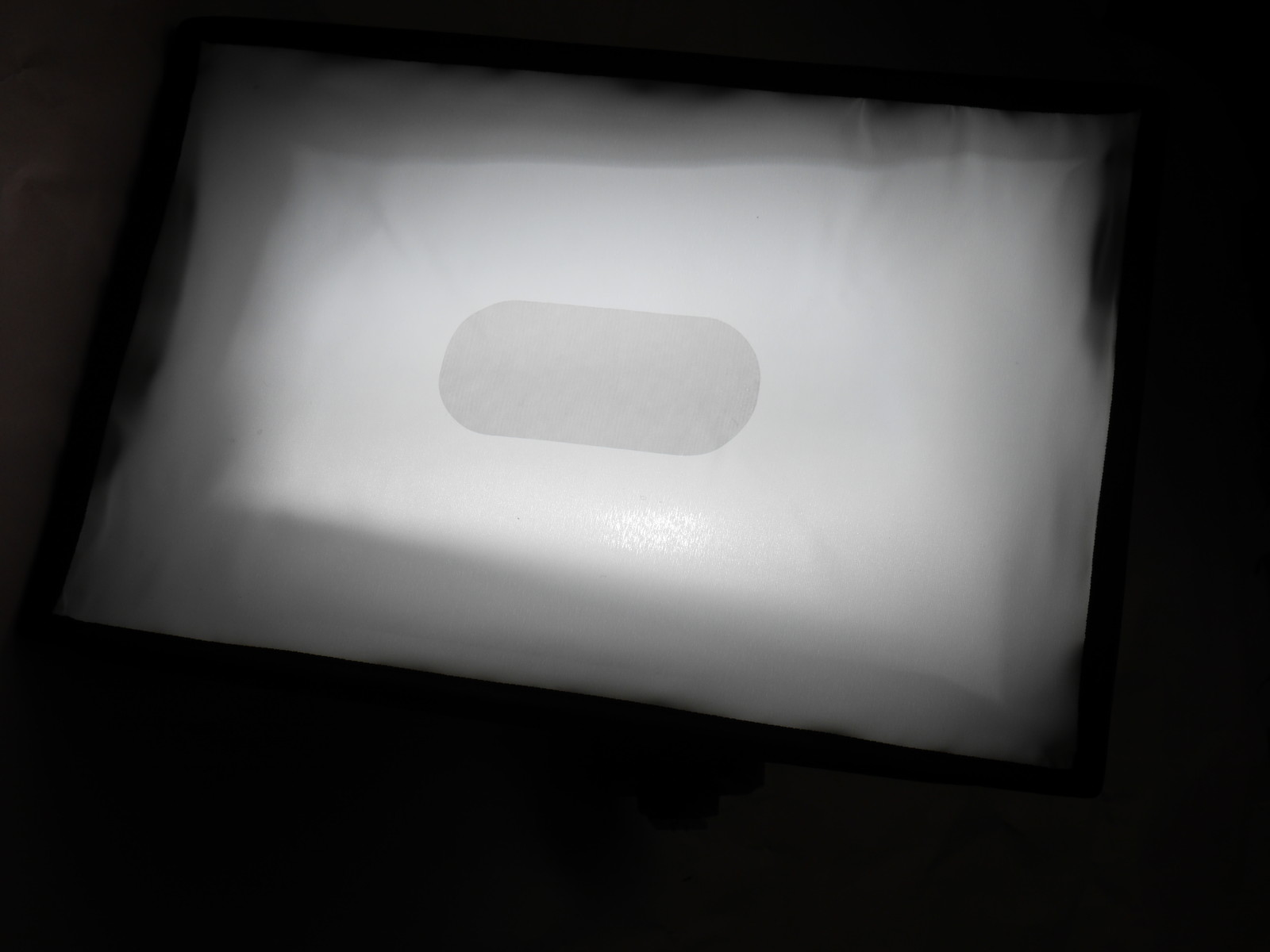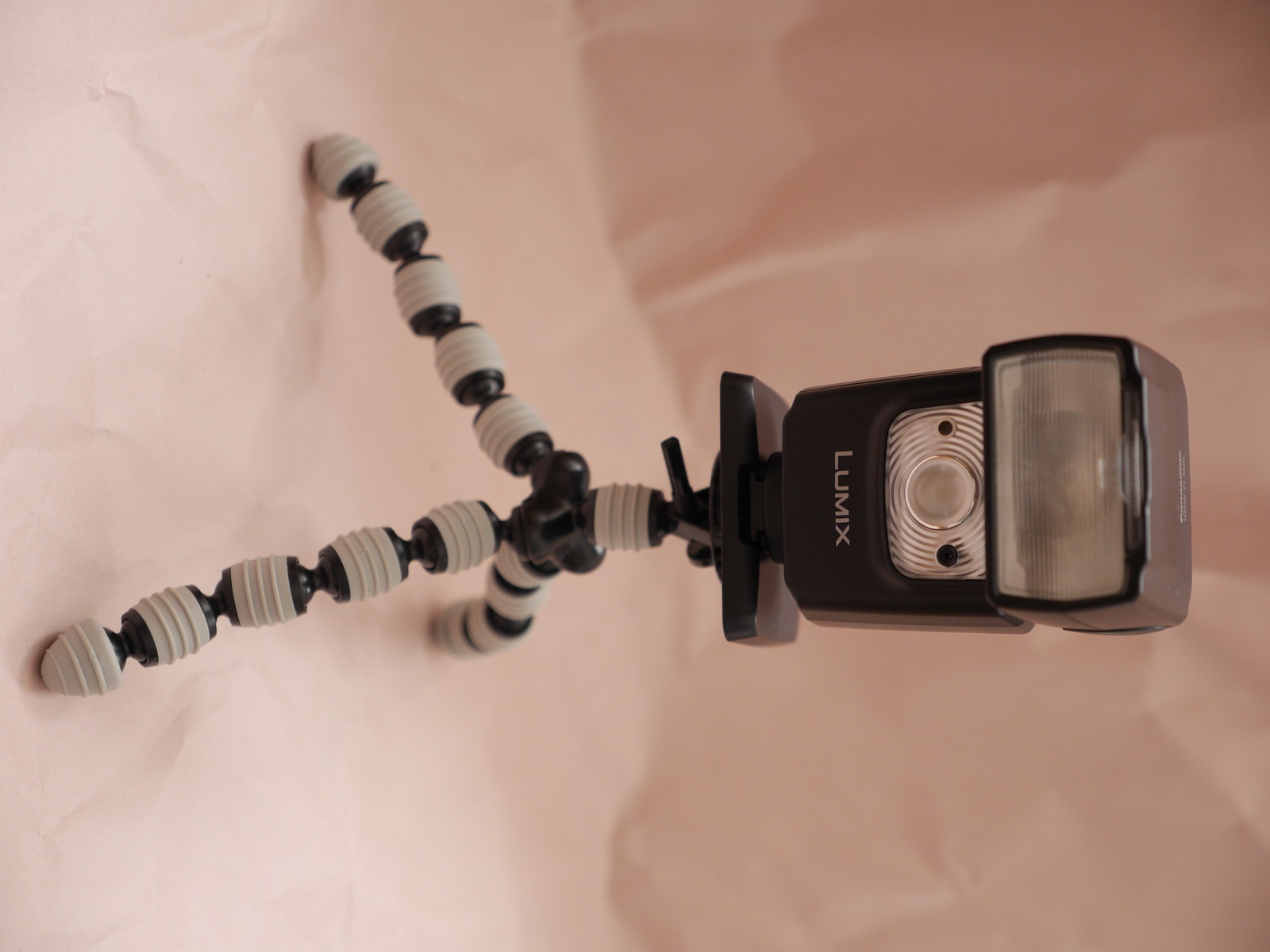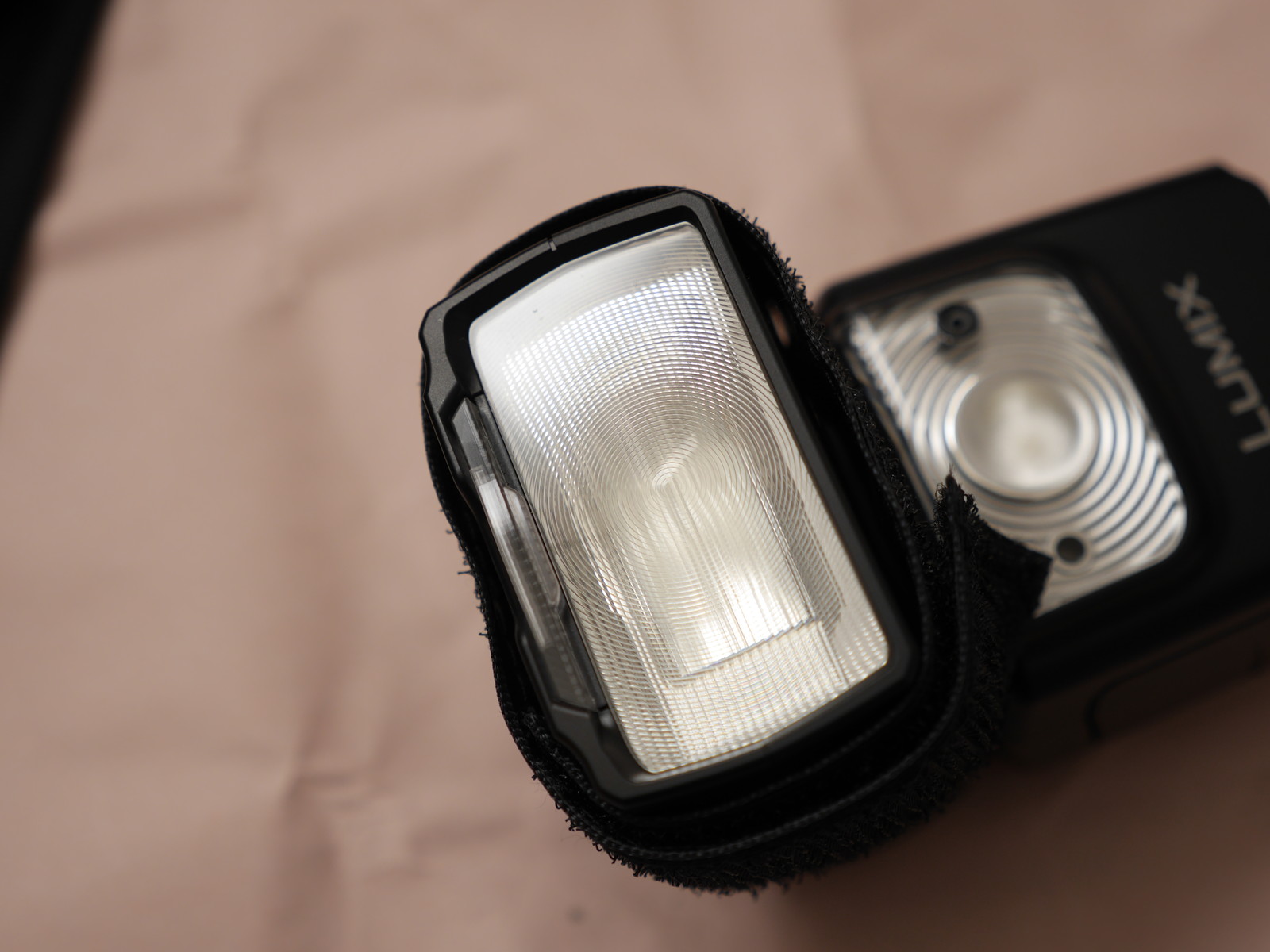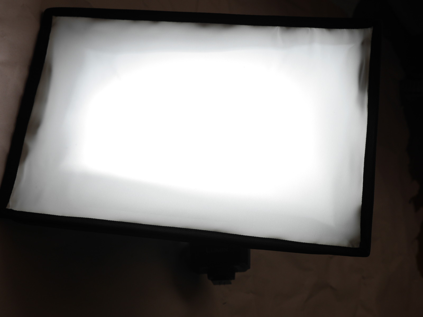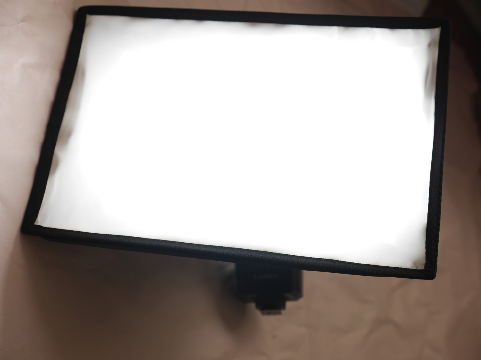 さてソフトボックス。20x30cmとクリップオンに使うには大きすぎ、離して使うには小さい微妙なサイズだけど安いので2個購入。内側は銀ではなく白半透明で、さらに外側にもう一枚白布をかぶせる仕様になっている。外側の布はマジックテープ固定なので剥せるが、利用方法は不明。正面の四角枠には金属の骨がはいっているが奥行方向には支持するものがまったくないのでぺちゃんんと潰れてしまうし、折り癖がついてたので、なおさら自立しない。フラッシュに固定する方法は、フラッシュにマジックテープ(滑り止めつき)を巻き付けて、ソフトボックス側のマジックテープにくっつける仕様。DMW-FL360Lだとちょっと余裕があった。もう一回り大きいフラッシュでもだいじょうぶそうだ。ディフューザの中心は布が二重になっていて簡易インナーディフューザとしているようだ。