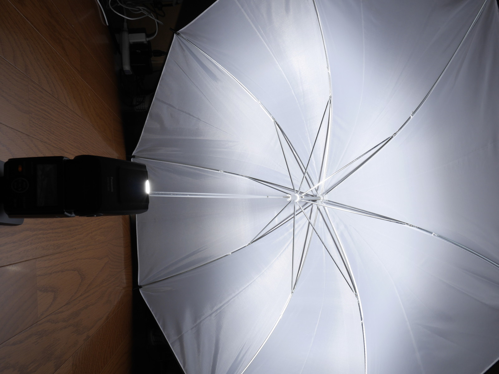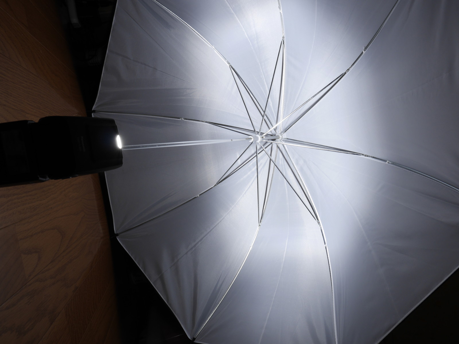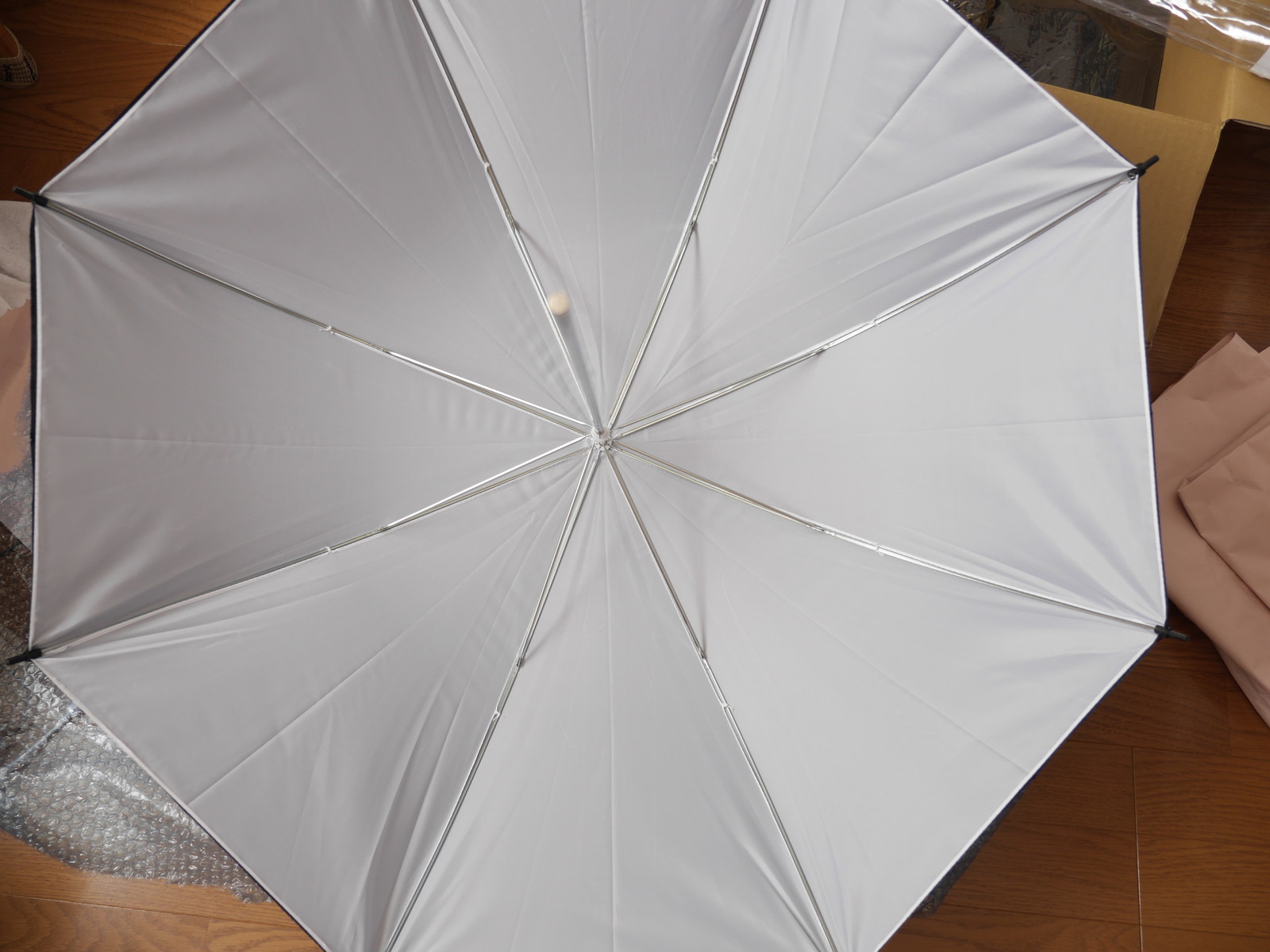 まずはアンブレラ。雨傘と違って閉じた状態ではロックできない。石突きと露先はプラスチック製。傘布は内側は半透明の白、外側は不透明の黒、あまり反射率は高くなさそう。アンブレラホルダーもライトスタンドももってないので床に置いてフラッシュを焚いてみる。m4/3での12mmだとちょっと照射角が足りなかったのでワイドパネルをひっぱり出して10mmにすれば傘全体に光が当たった。アンブレラはソフトボックスとちがって影が二重になったりするらしいが、携帯性があるわりに面積を稼げるのがメリットか。カサトレとかそんな面倒なことはたぶんしないだろう。