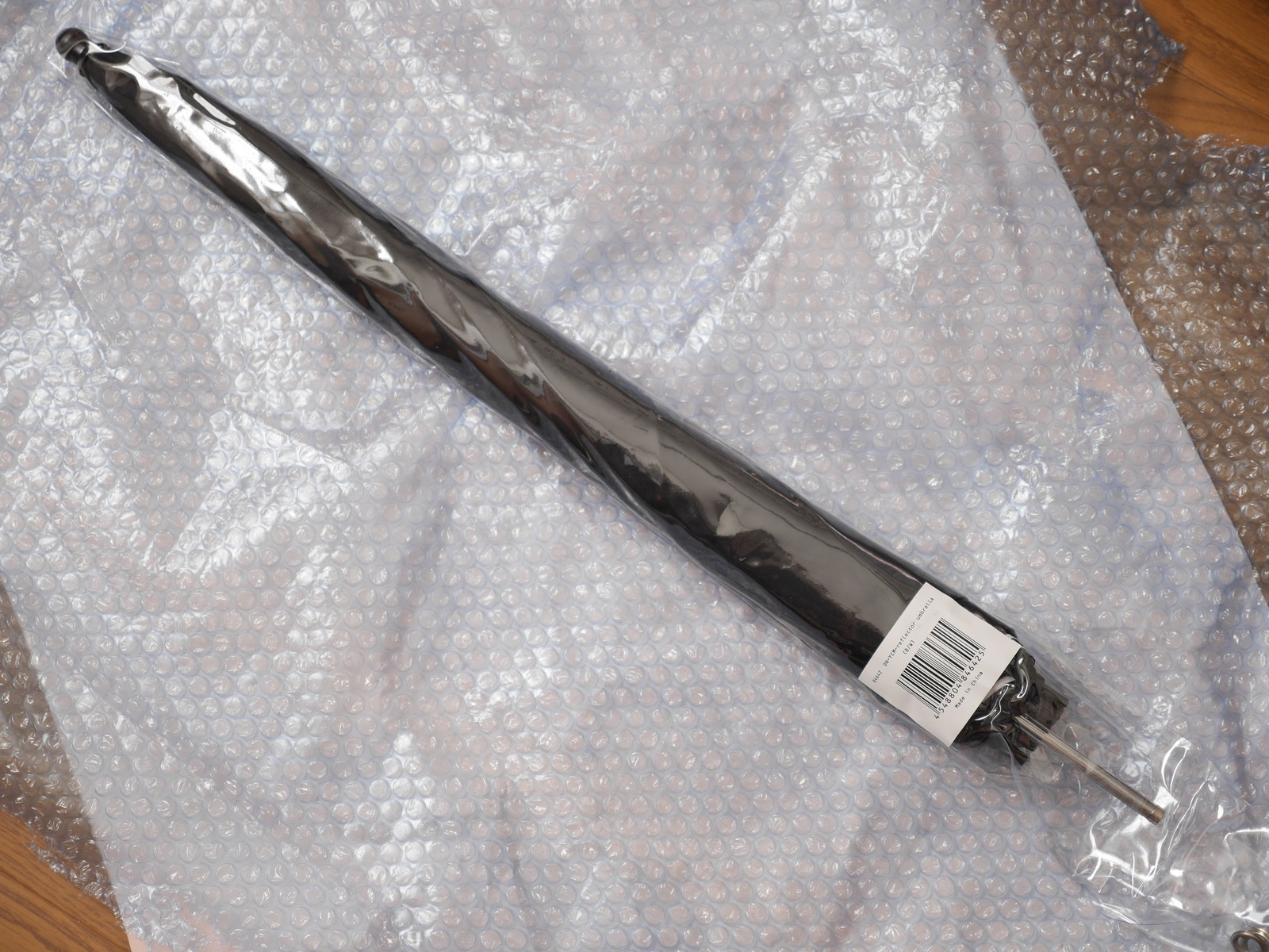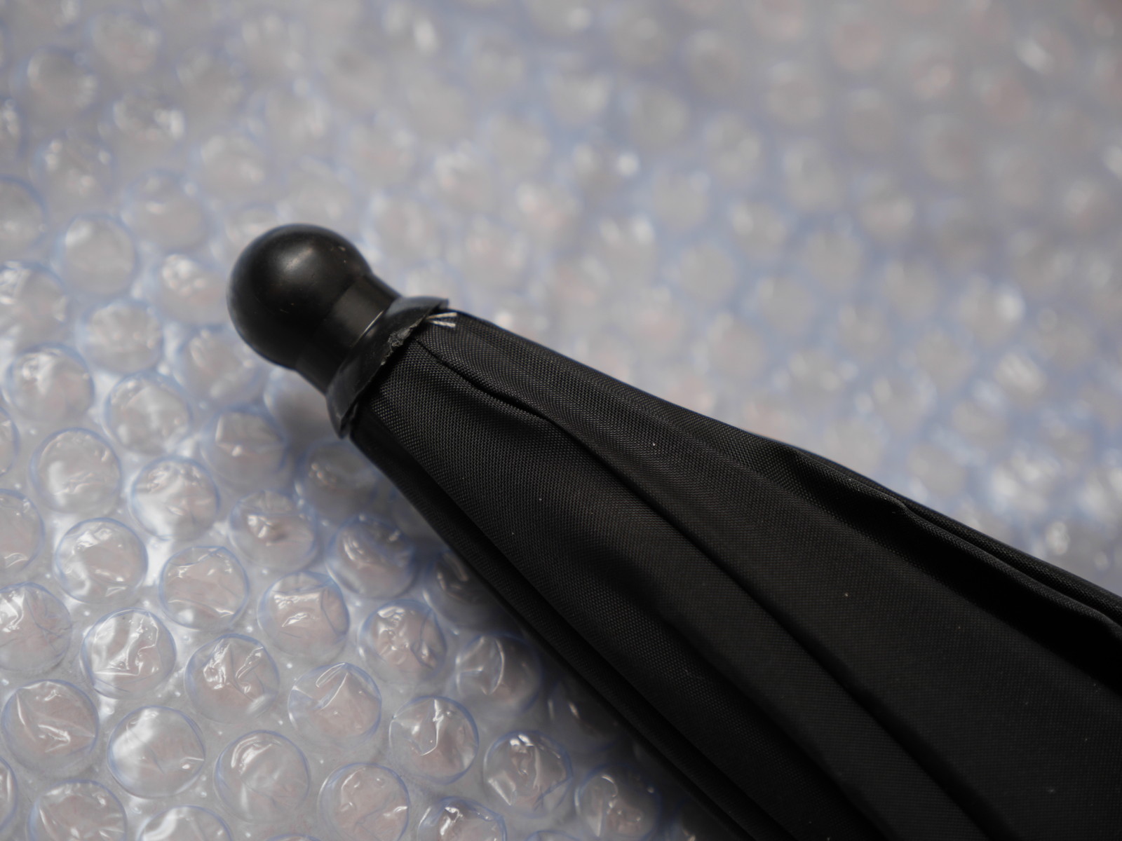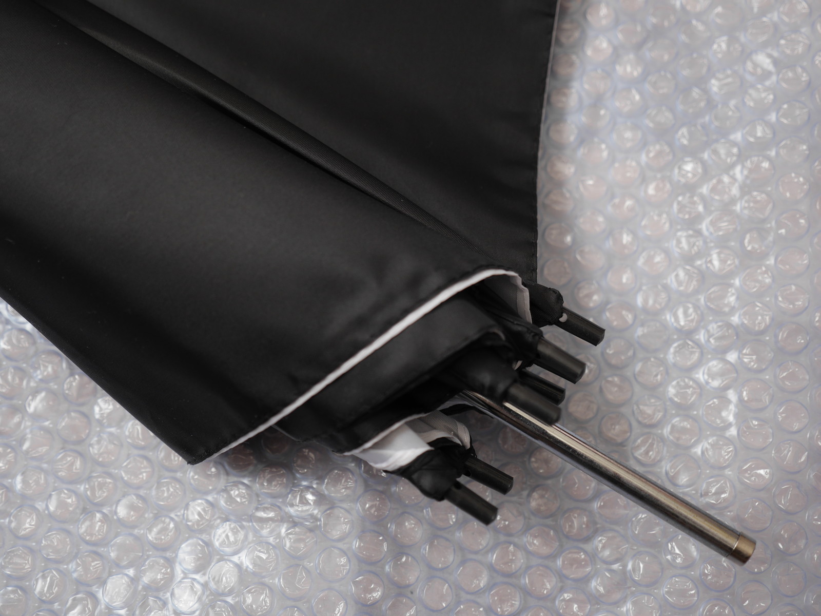 まずはアンブレラ。雨傘と違って閉じた状態ではロックできない。石突きと露先はプラスチック製。傘布は内側は半透明の白、外側は不透明の黒、あまり反射率は高くなさそう。アンブレラホルダーもライトスタンドももってないので床に置いてフラッシュを焚いてみる。m4/3での12mmだとちょっと照射角が足りなかったのでワイドパネルをひっぱり出して10mmにすれば傘全体に光が当たった。アンブレラはソフトボックスとちがって影が二重になったりするらしいが、携帯性があるわりに面積を稼げるのがメリットか。カサトレとかそんな面倒なことはたぶんしないだろう。