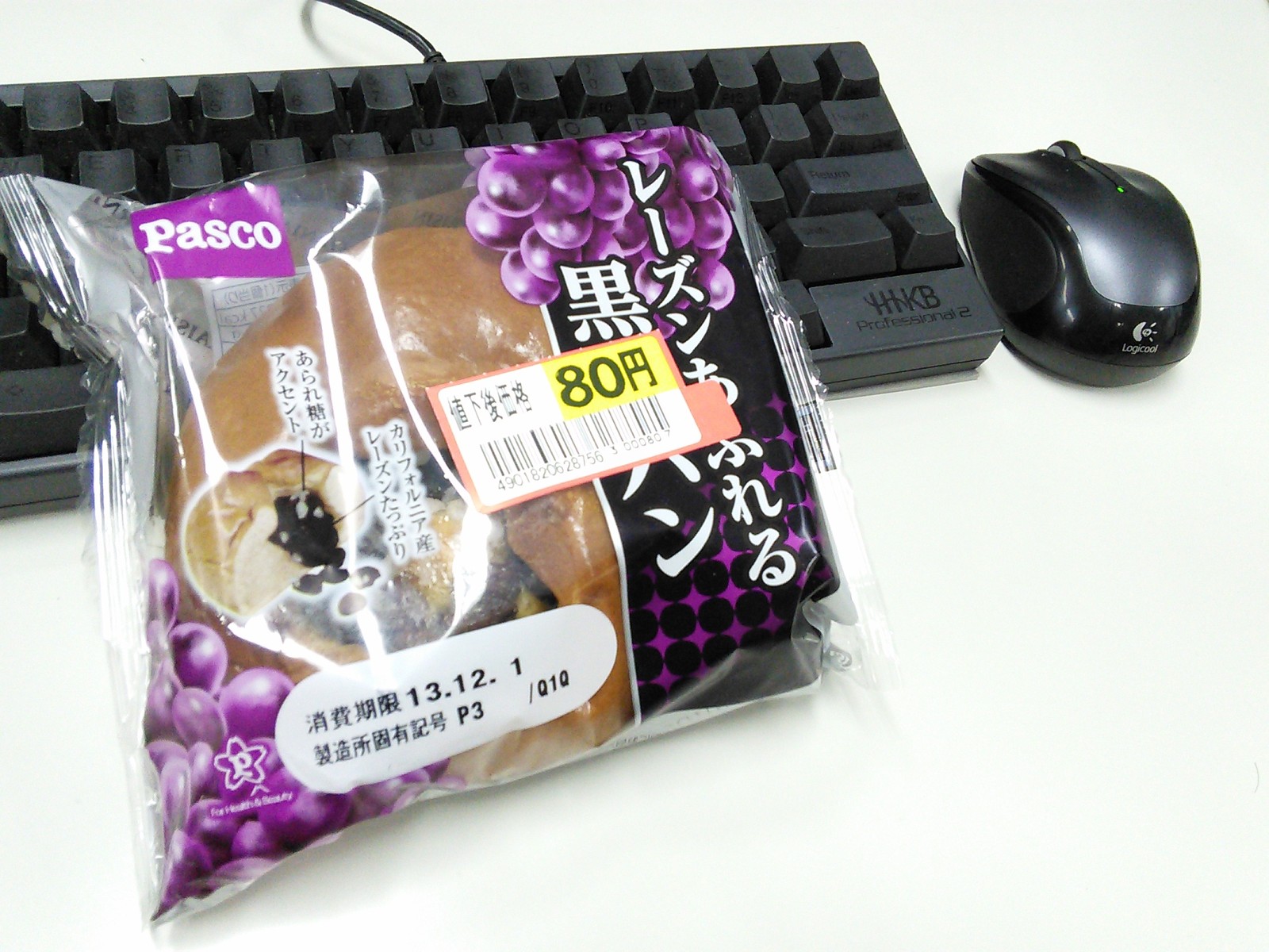 練習後の補食: ペプチド数グラム、Pasco レーズンあふれる黒糖パン(327kcal,たん白質5.7g,脂質9.5g,炭水化物54.7g)。
