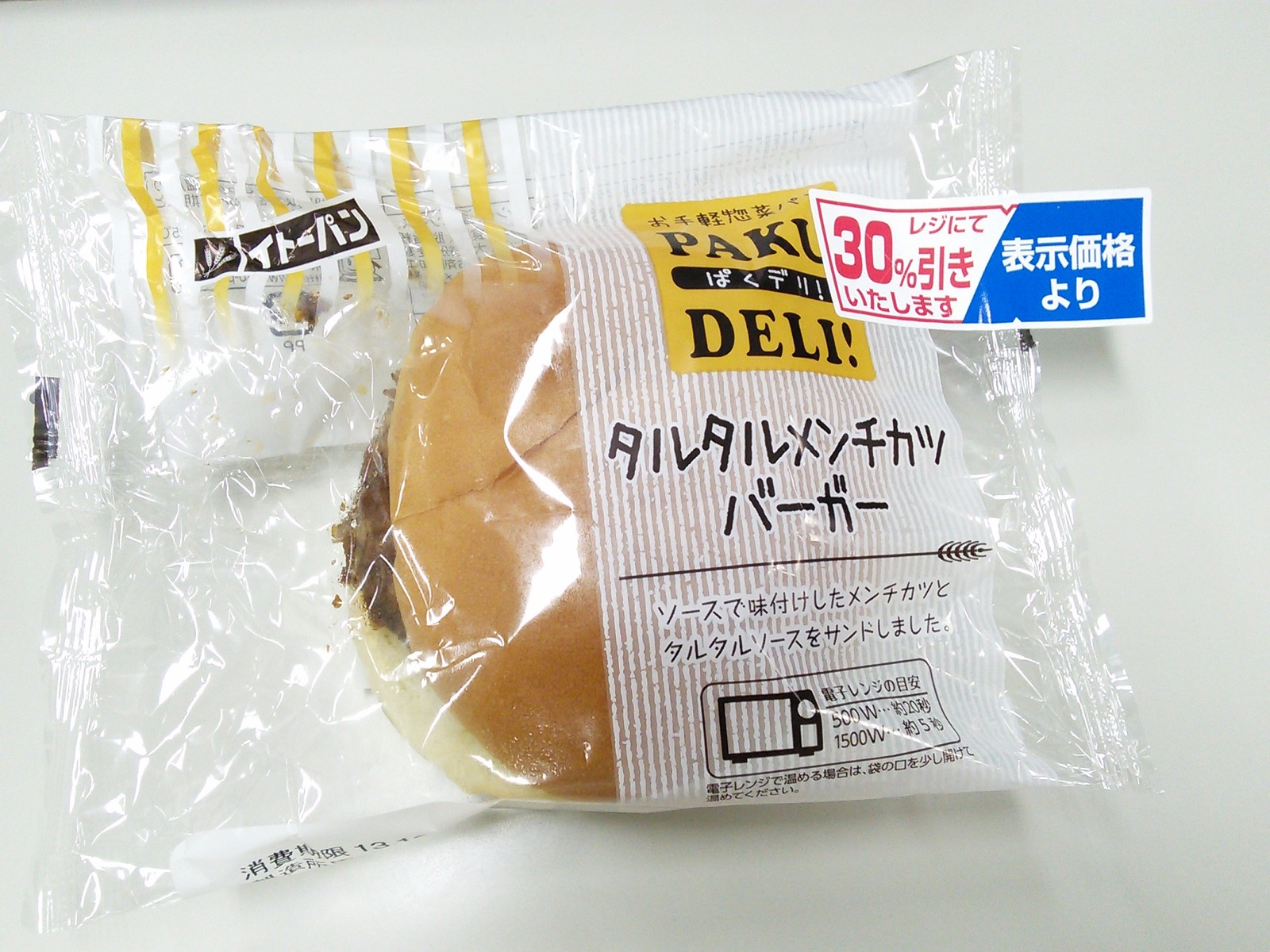練習後の補食: ペプチド数グラム、イトーパン タルタルメンチカツバーガー(347kcal,たん白質7.5g,脂質20.5g,炭水化物33.2g)。