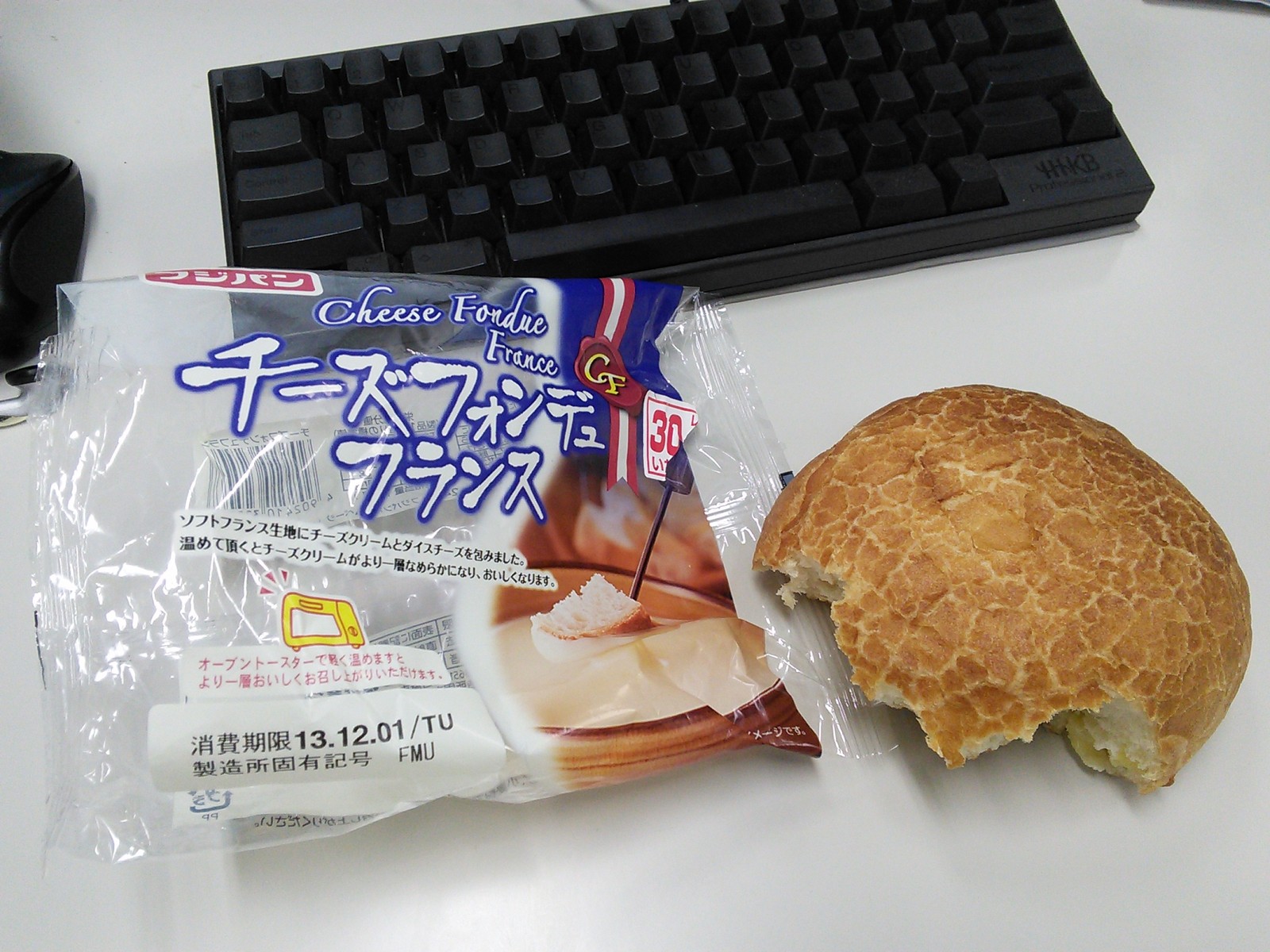 練習後の補食: ペプチド数グラム、フジパン チーズフォンデュ フランス(330kcal,たん白質9.0g,脂質15.0g,炭水化物39.8g)。