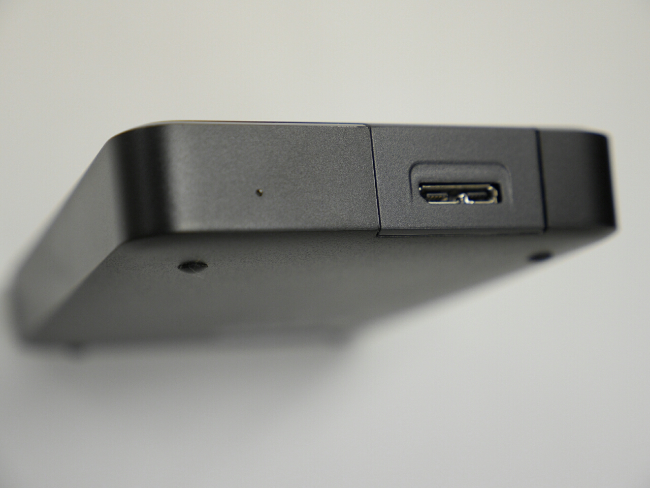 アクセスランプは白色。ちょっとまぶしい。USBをつなぐと点灯、アクセス中は点滅、省電力のためスピンダウンするとゆっくり点滅、のようだ。底にちっちゃいゴム足がついているが、あまりグリップはよくない。モバイル用なので付属のケーブルは短く46cm。