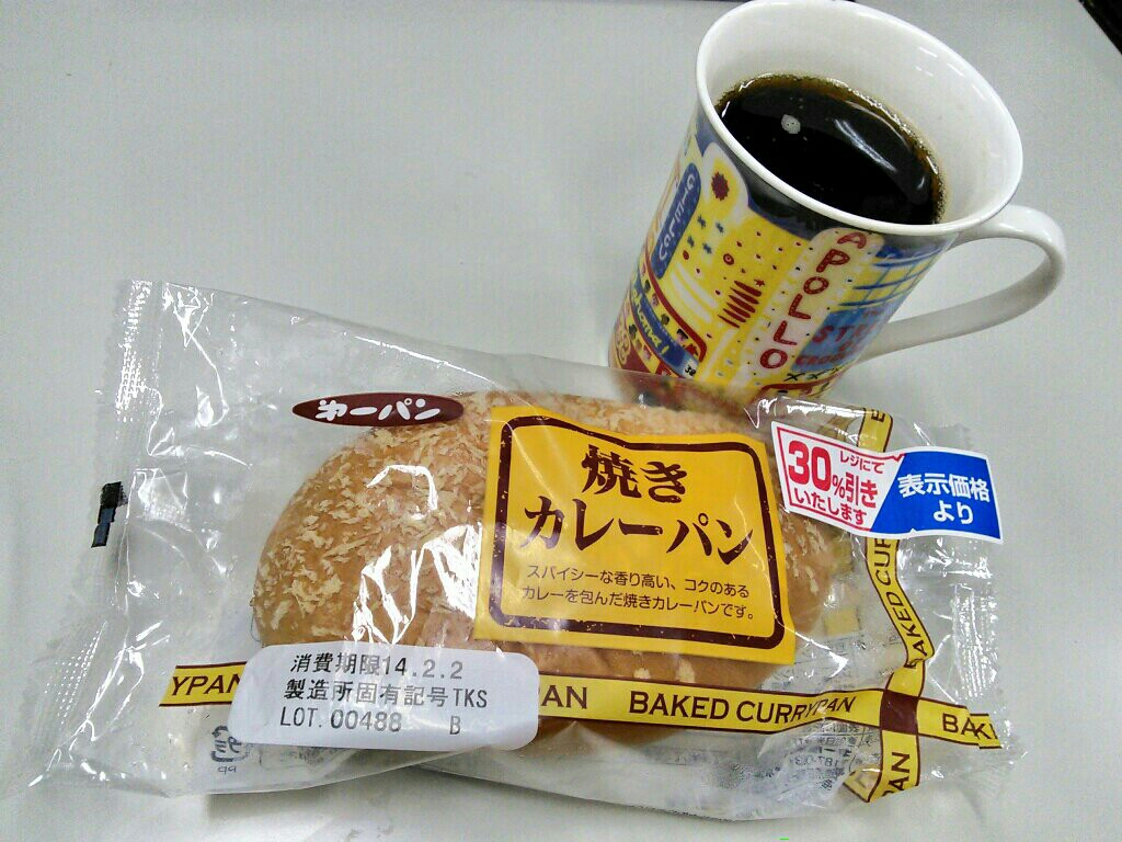 練習後の補食: ペプチド数グラム、第一パン 焼きカレーパン(244kcal,たん白質7.5g,脂質4.6g,炭水化物43.0g)、コカコーラ200ml。