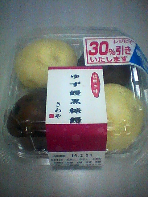練習後の補食: ペプチド数グラム、さわや ゆず饅黒糖饅。
