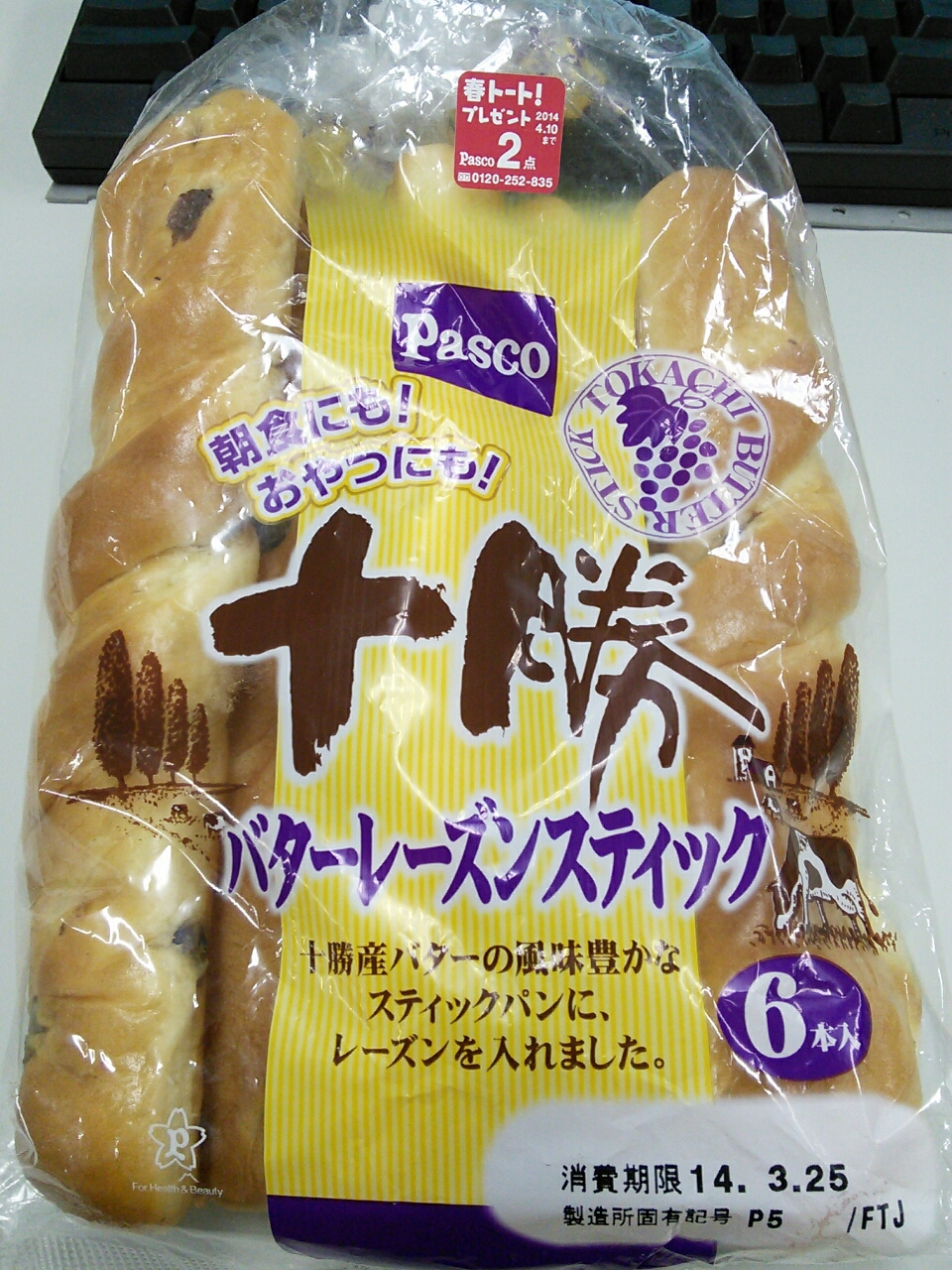 練習後の補食: ペプチド数グラム、パスコ 十勝バターレンズンスティック(111kcal,たん白質2.4g,脂質3.0g,炭水化物18.5g)*4。