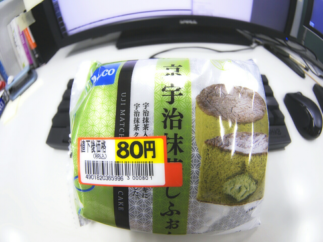 練習後の補食: ペプチド数グラム、Pasco 京宇治抹茶しふぉん(308kcal,たん白質5.4g,脂質13.1g,炭水化物42.1g)。