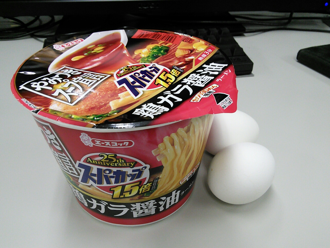 練習後の夕食: ペプチド数グラム、エースコック スーパーカップ 鶏ガラ醤油(489kcal,たん白質9.3g,脂質19.4g,炭水化物69.2g)、ゆで玉子*2、Pasco あずきくるみデニッシュ(448kcal,たん白質9.2g,脂質22.2g,炭水化物52.9g)。