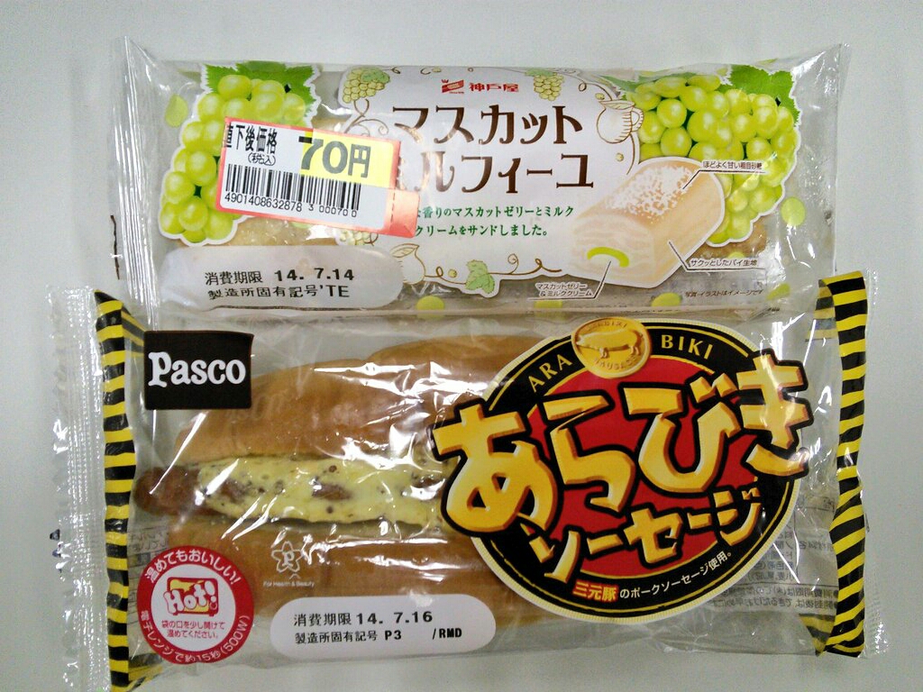 練習後の補食: ペプチド数グラム、Pasco あらびきソーセージ(316kcal,たん白質7.8g,脂質16.4g,炭水化物34.3g)、神戸屋 マスカットミルフィーユ(373kcal,たん白質4.1g,脂質20.6g,炭水化物g43.2)。