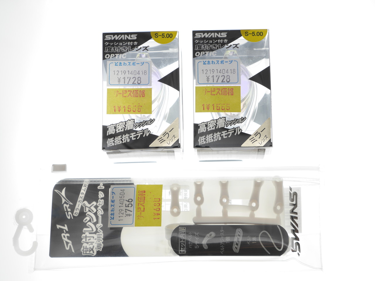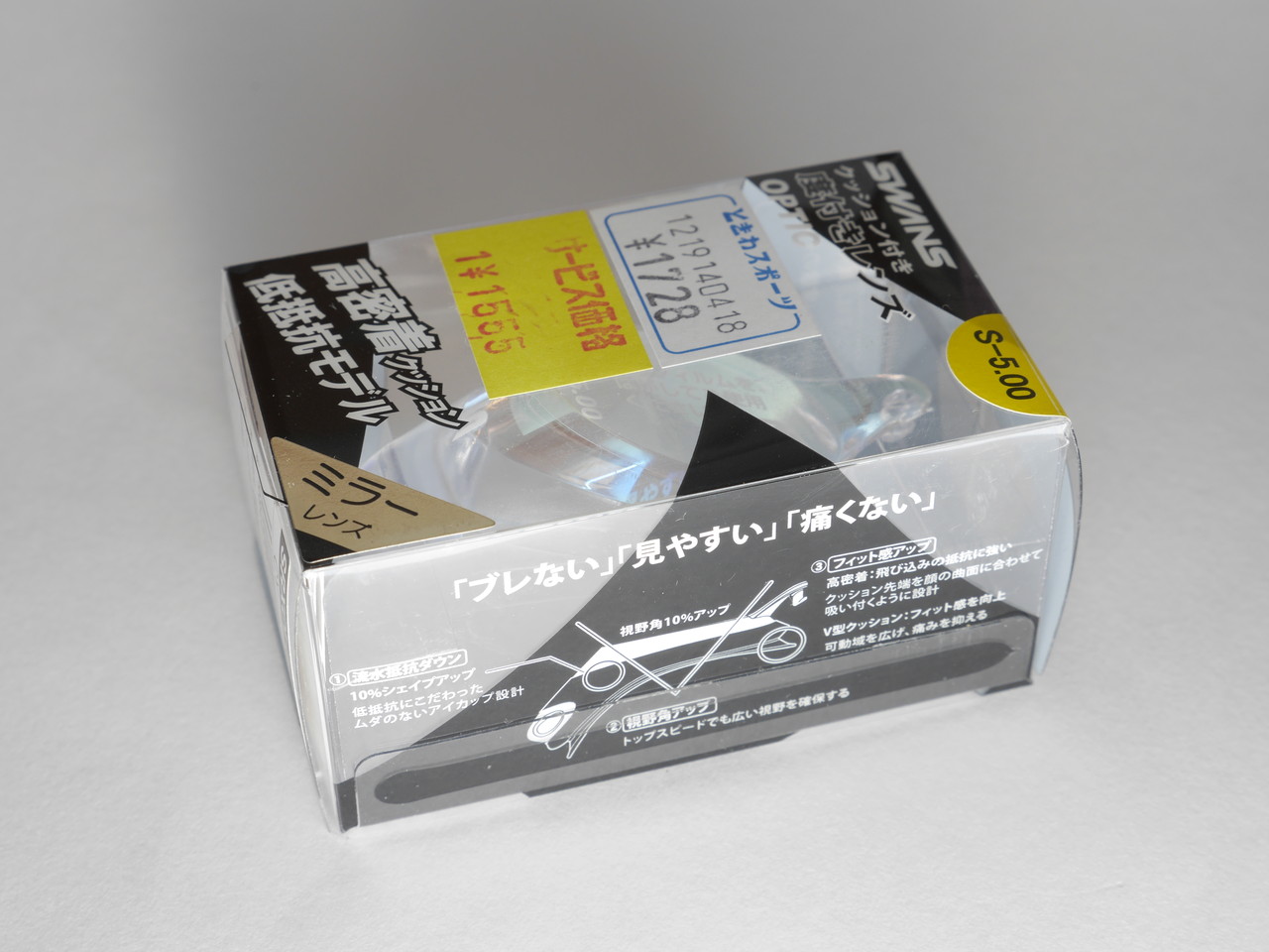 今回はミラータイプSRXCL-Mにしてみた。ミラーだとちょっと値段が高いのと、傷が目立つかなと思って避けていたが、屋外プールで泳ぐときにいいかなとおもって。度はいままでと同じS-5.0で。鼻ベルトも黄変してきているのでパーツセットも購入。締めて3411円也。