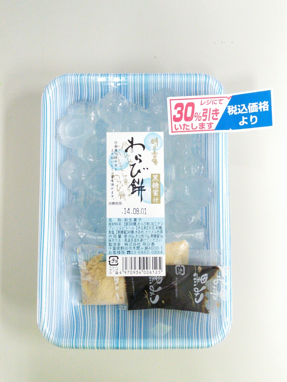 練習後の補食: 明日香 わらび餅(黒糖密付)(200kcal,たん白質0.0g,脂質0.0g,炭水化物49.9g)(きな粉43kcal,黒糖蜜26kcal)。おそろしいな、わらび餅単体では脂質もたん白質も0。きな粉にタンパク質と脂質ははいってるとおもうけど。
