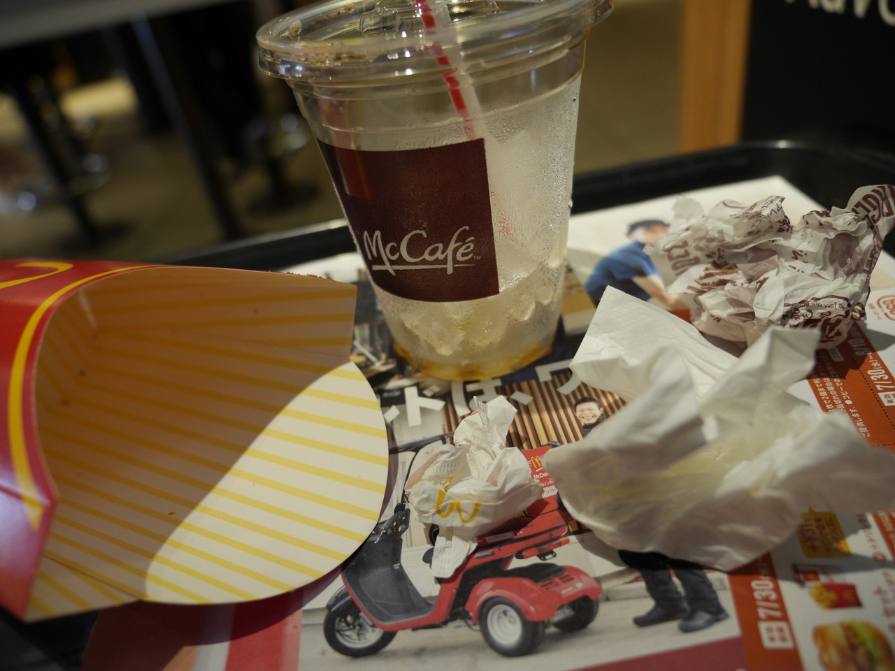 近くのマクドナルドで昼食。チキンクリスプは中国産チキンの品質問題の影響で販売中止だったので、ノーマルハンバーガーと150円ポテトLとアイスコーヒーで粘る。