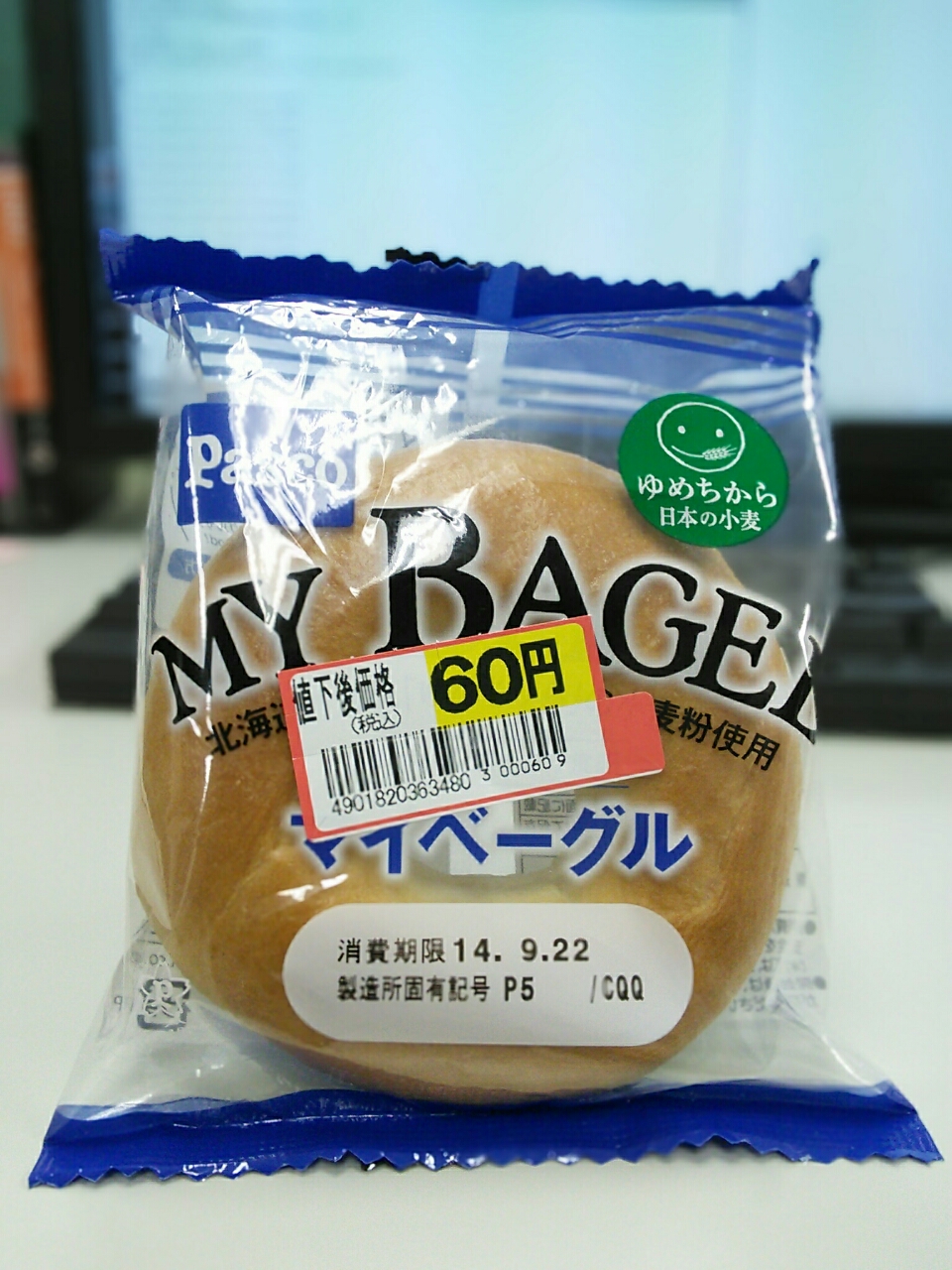 練習後の補食: ペプチド数グラム、Pasco マイベーグル(248kcal,たん白質7.6g,脂質2.5g,炭水化物48.8g)。