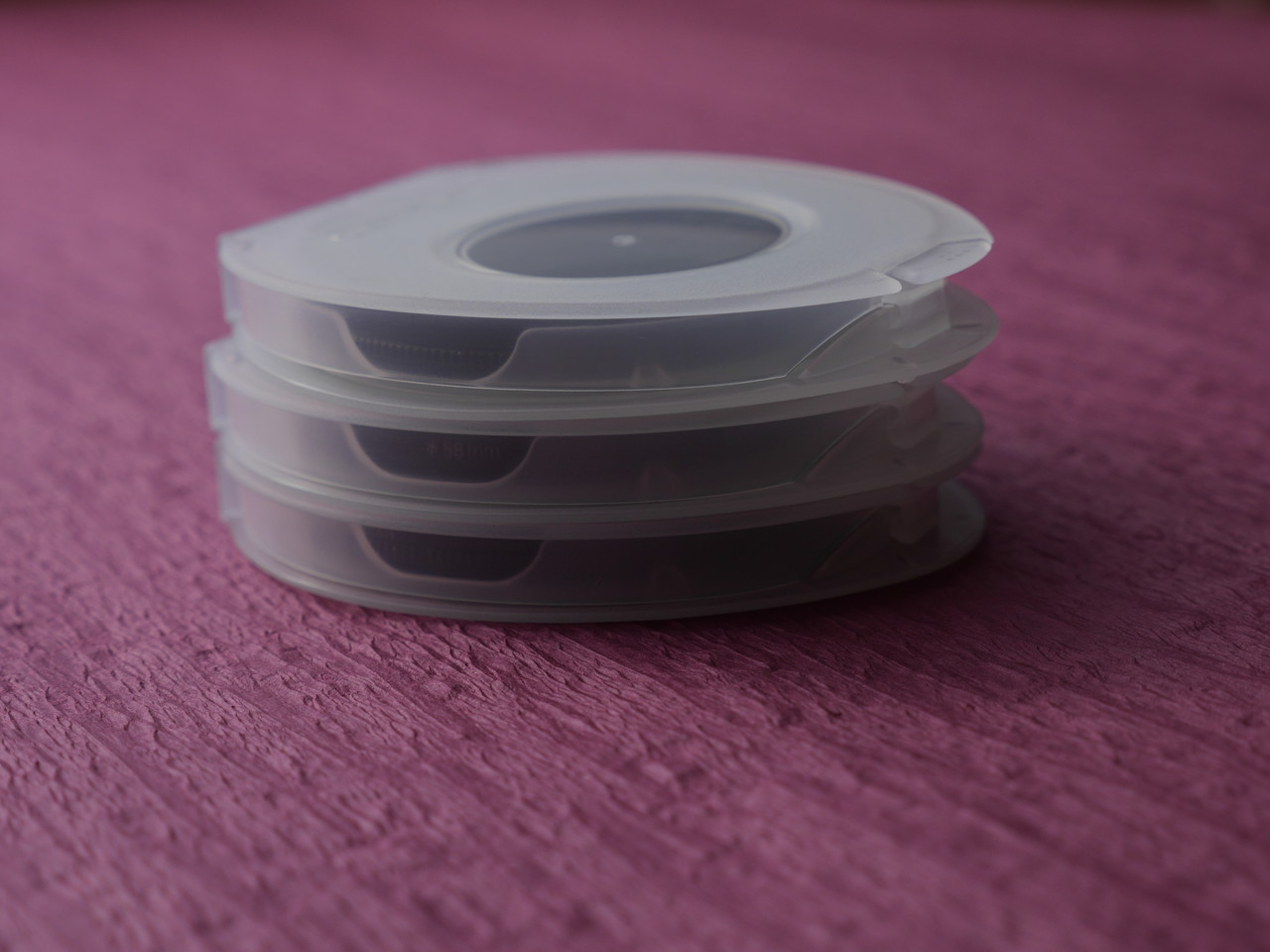 さっそく手持ちのフィルタを入れてみる。パナソニックのCPLはちょうどぴったり収まったが、中華GREEN.Lのはちょっと無理があるかんじ。下の写真で3段に重ねた一番上がそれ。ちなみにじっさいにノギスで測った人によると8.65mmらしい。