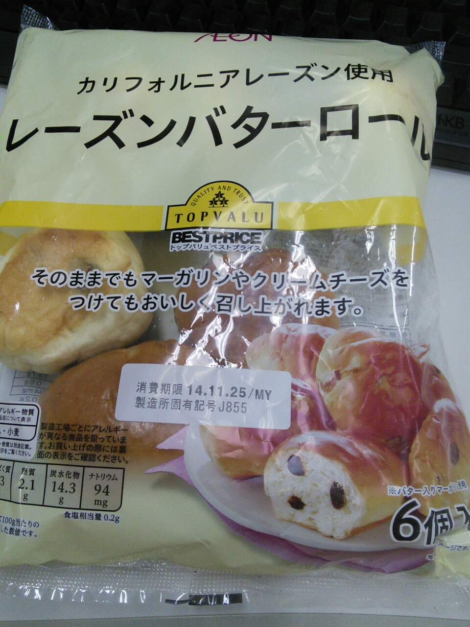 練習後の補食: ペプチド数グラム、TV レーズンバターロール(84kcal,たん白質2.3g,脂質2.1g,炭水化物13.7g *6)。