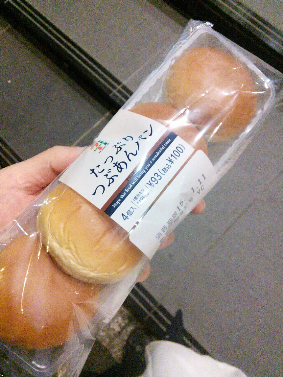 練習後の補食: たっぷりつぶあんパン(119kcal,たん白質2.9g,脂質0.9g,炭水化物24.8g *4)。