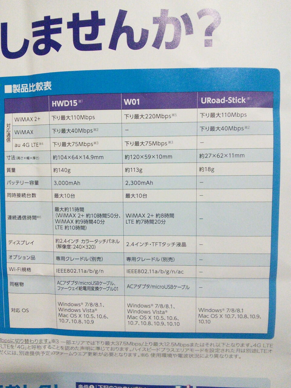 モバイルルータタイプはHWD15とW01がラインナップされていて