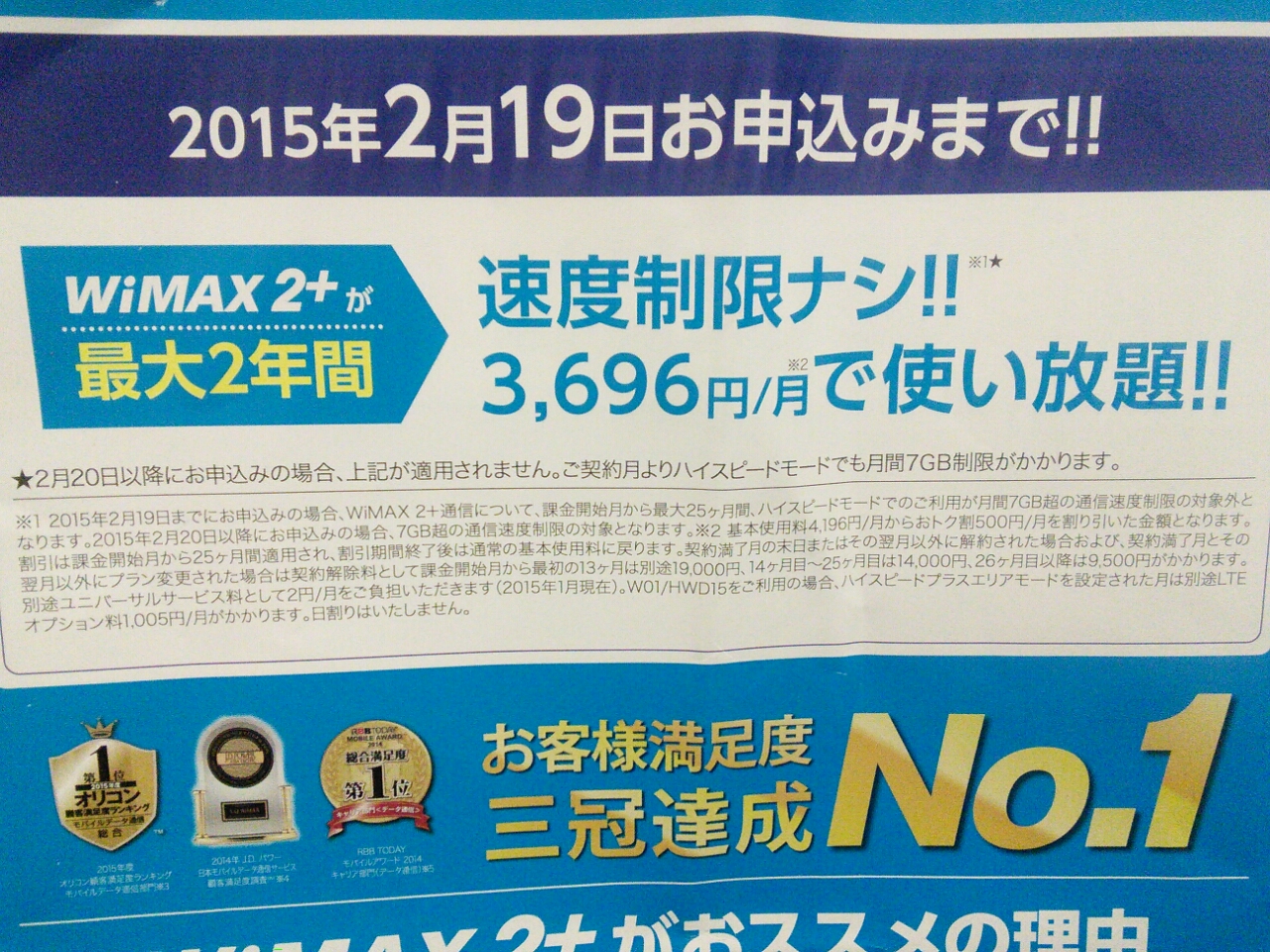 あ!申し込んだのは2/20だが2/19に申し込んでたら7GB制限が25ヶ月間解除だったのか?最悪のタイミングだったな。2時間ほどskypeで話したくら1GBいってしまうので7GB制限はきついもともとWiMAXは制限なしが売り文句だったけどさすがに設備投資がきつくなってきたのかWiMAX2+移行のタイミングで制限をぶち込んできた。同情はするが納得はできんな。