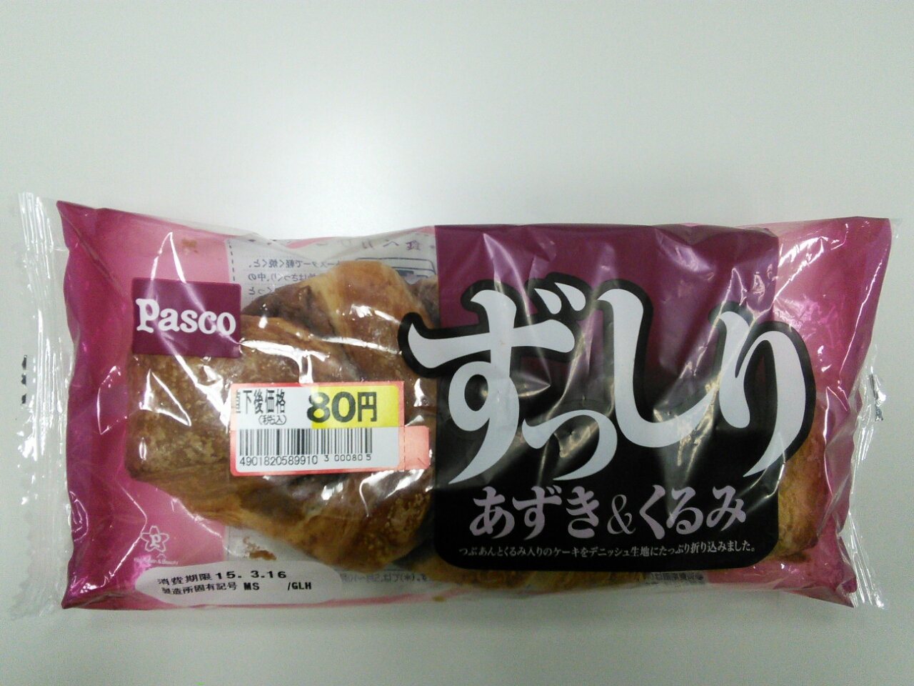 練習後の補食: ペプチド数グラム、Pasco ずっしりあずき&くるみ(545kcal,たん白質9.1g,脂質24.5g,炭水化物71.9g)。