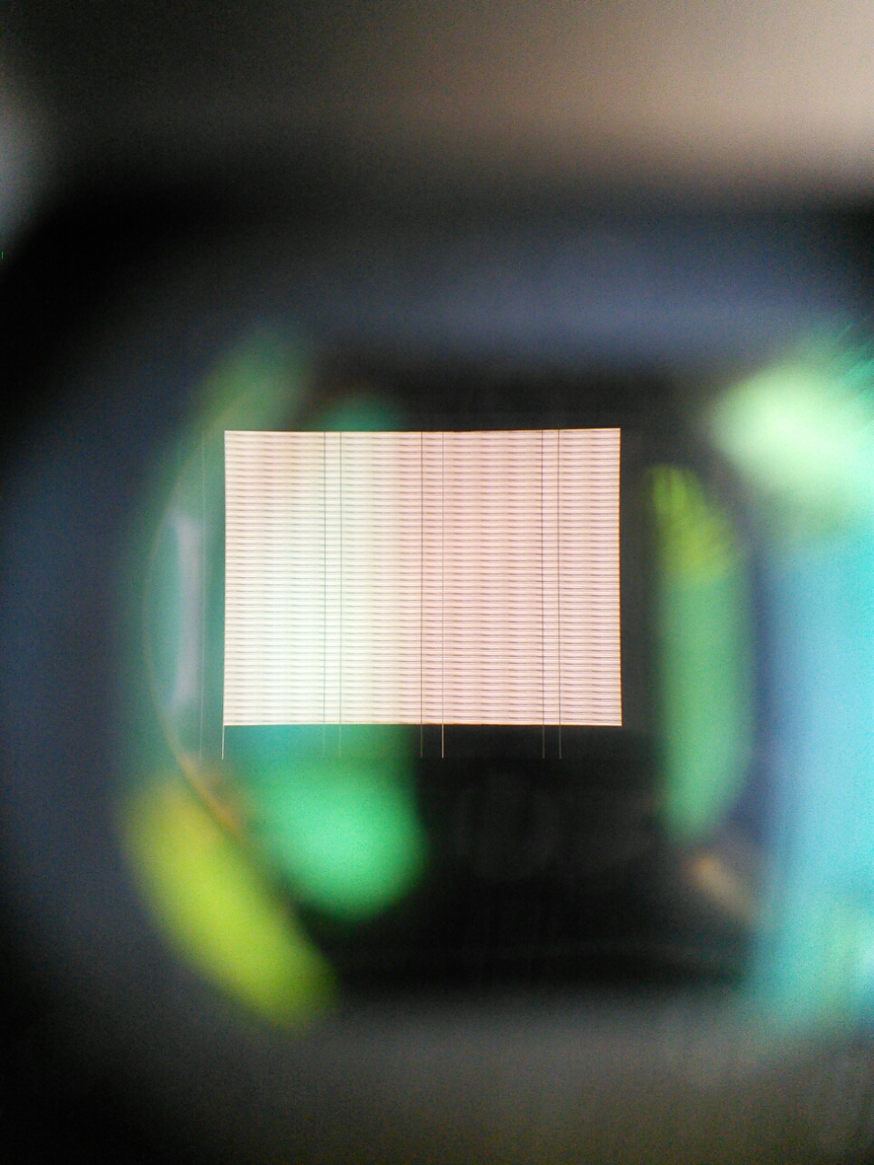 ファインダーはこんな感じで斜め線いっぱい状態。桜を撮ってたので固まった画面もそれっぽい色。