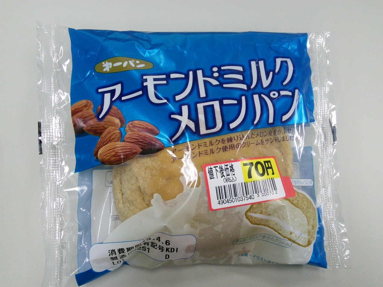 練習後の補食: ペプチド数グラム、第一パン アーモンドミルクメロンパン(348kcal,たん白質6.1g,脂質9.2g,炭水化物59.9g)。