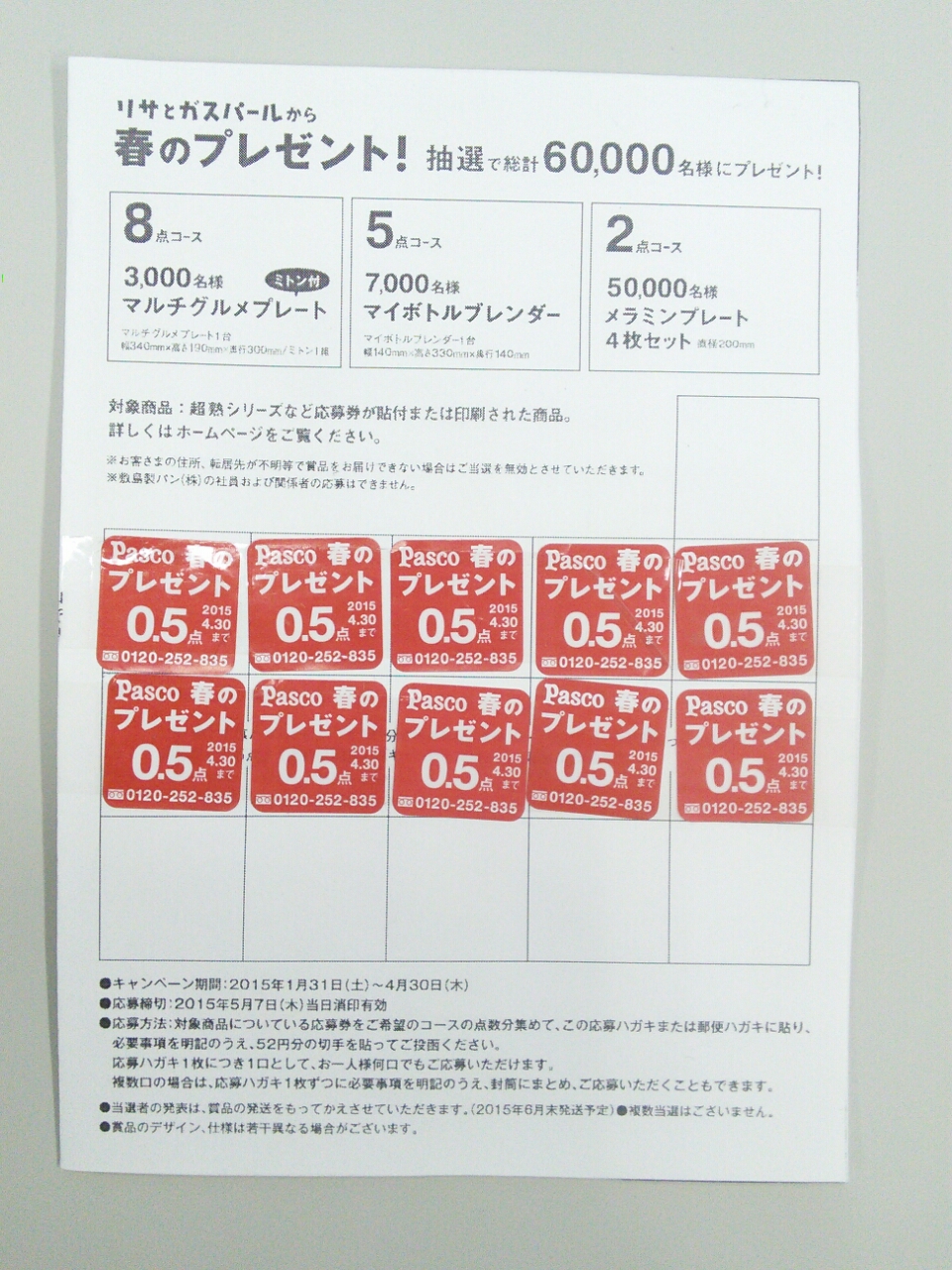 Pascoリサとガスパールから春のプレゼント!、今年は点数あつめたら必ずもらえるんじゃなくて抽選。そのぶん点数は低く抑えられている。あたるかなぁ。