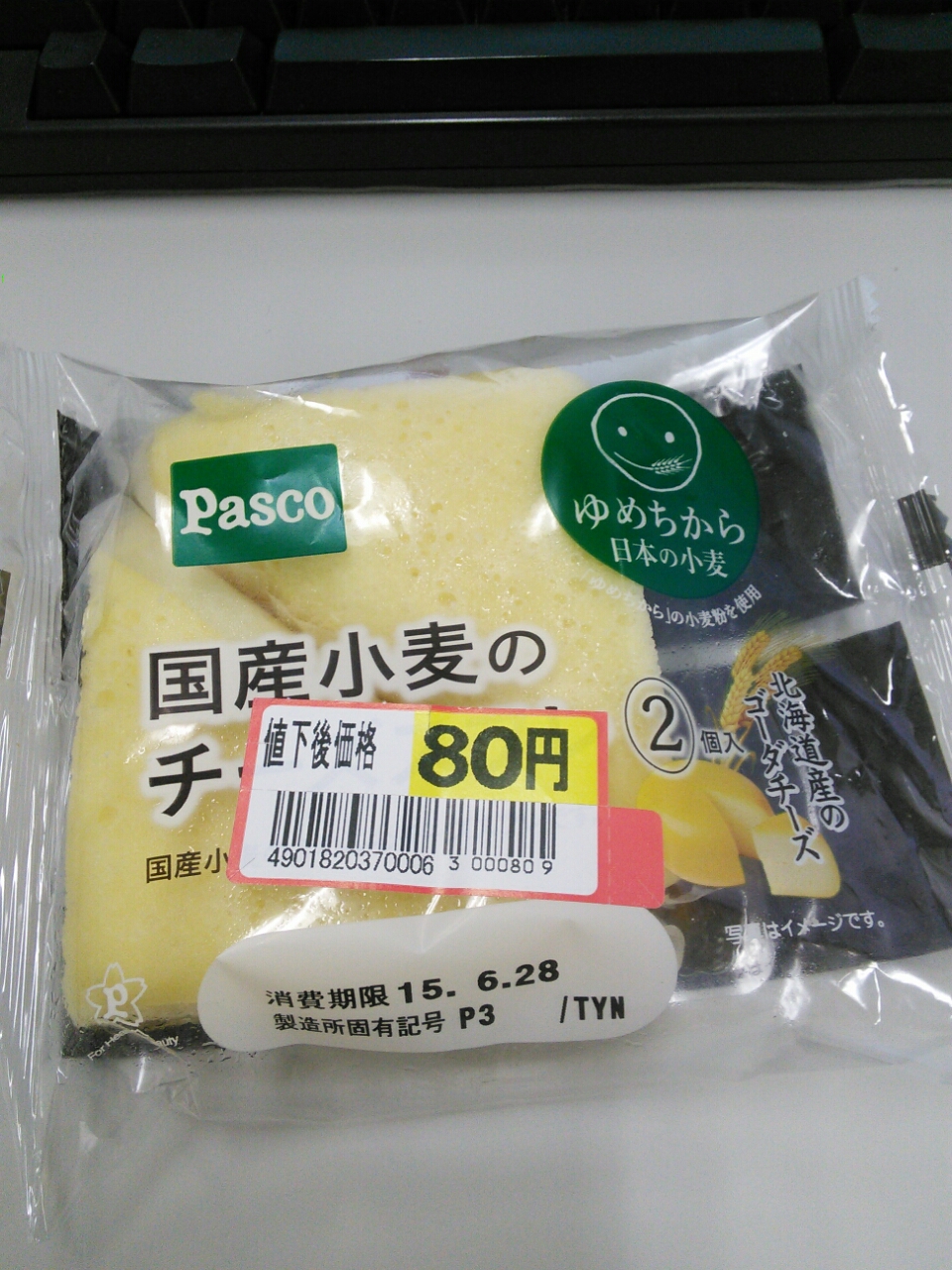 練習後の補食: Pasco 国産小麦のチーズスフレ(361kcal,たん白質6.5g,脂質18.5g,炭水化物42.1g)。