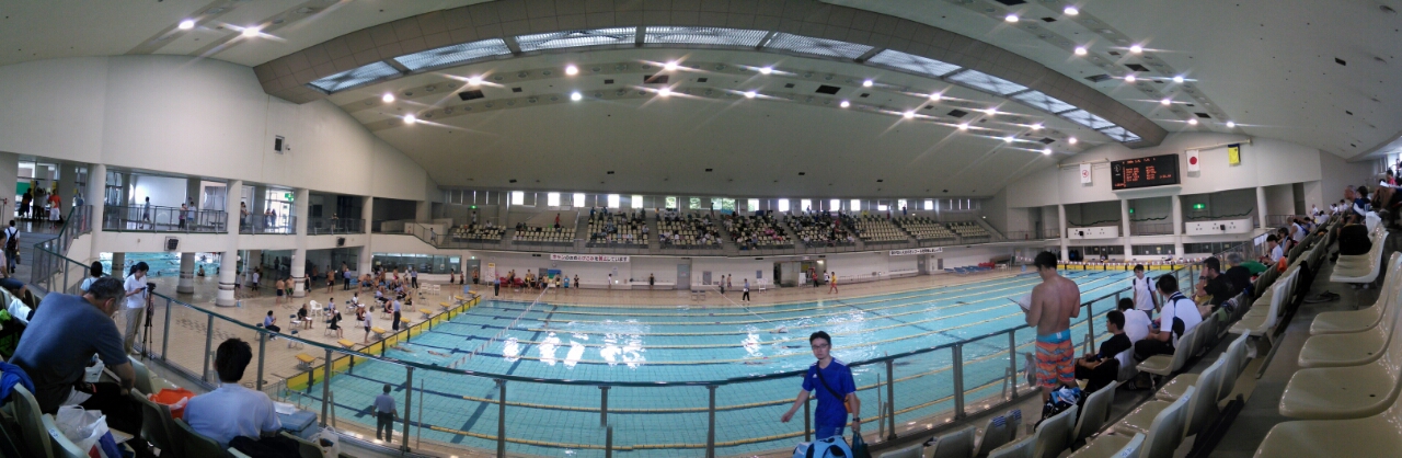 朝家を出ようとしたら急に雨が降ってきた。雨量観測情報をみると局所的なので待ってみる。30分くらい待ったら止んだので(念のためにバッグにレインカバーをつけて)自転車で銀河アリーナへ。着いたらちょうど開会式が始まったところ。あいかわらずプール場内は窓全開だけど蒸し暑い。