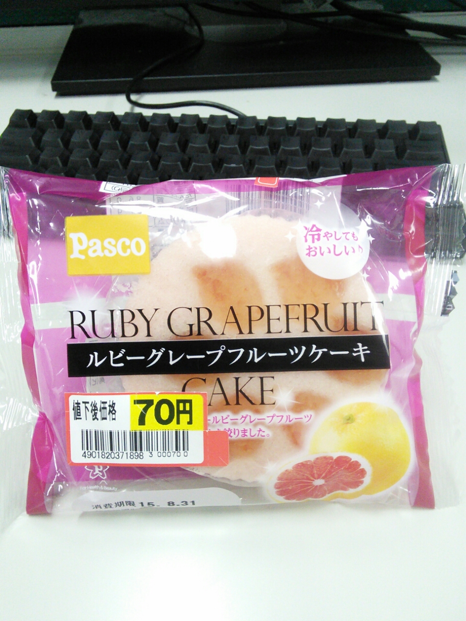 練習後の補食: Pasco ルビーグレープフルーツケーキ(270kcal,たん白質4.5g,脂質8.6g,炭水化物43.7g)。