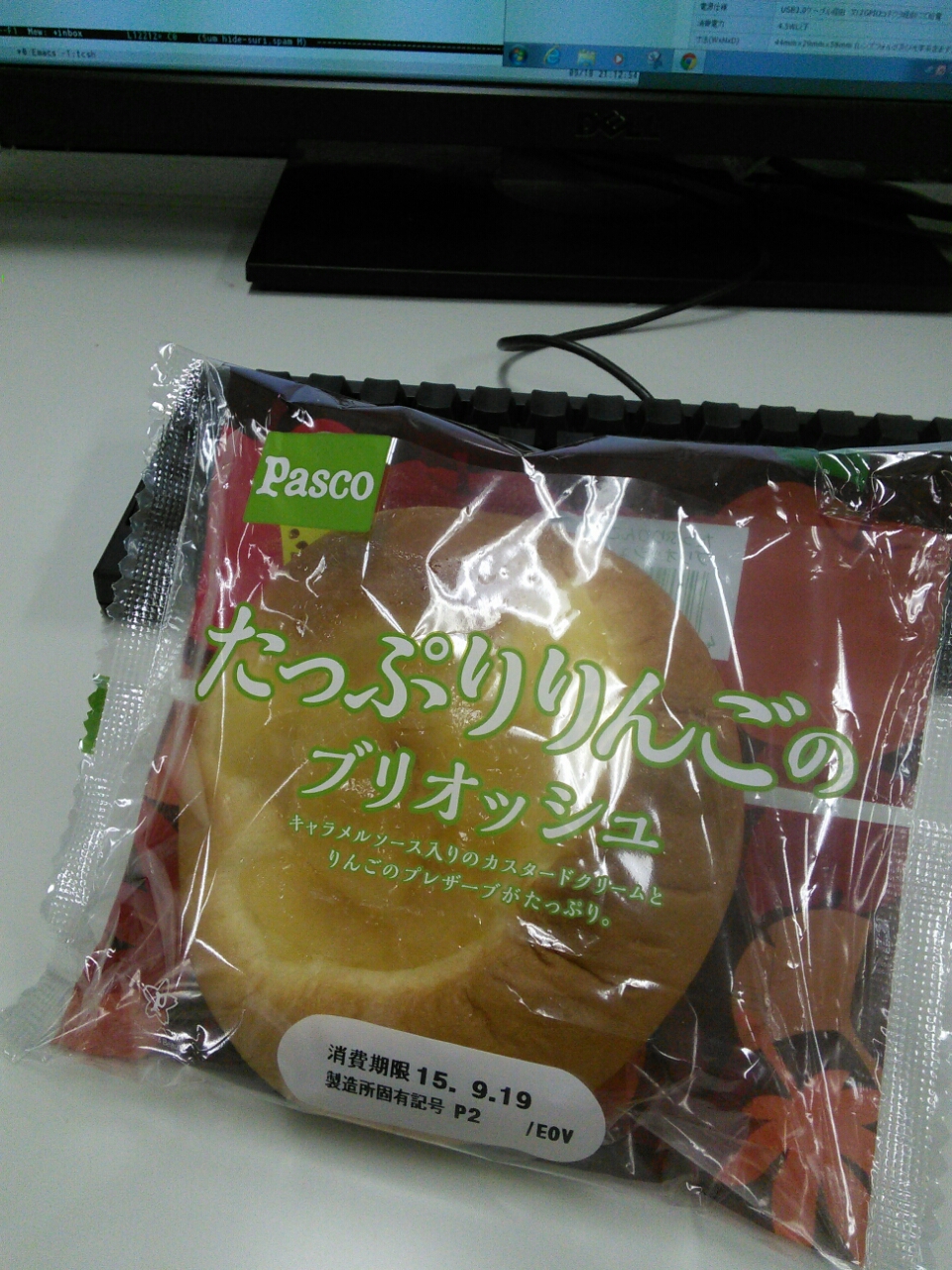 練習後の補食: Pasco たっぷりりんごのブリオッシュ(258kcal,たん白質4.1g,脂質g5.9,炭水化物47.2g)。