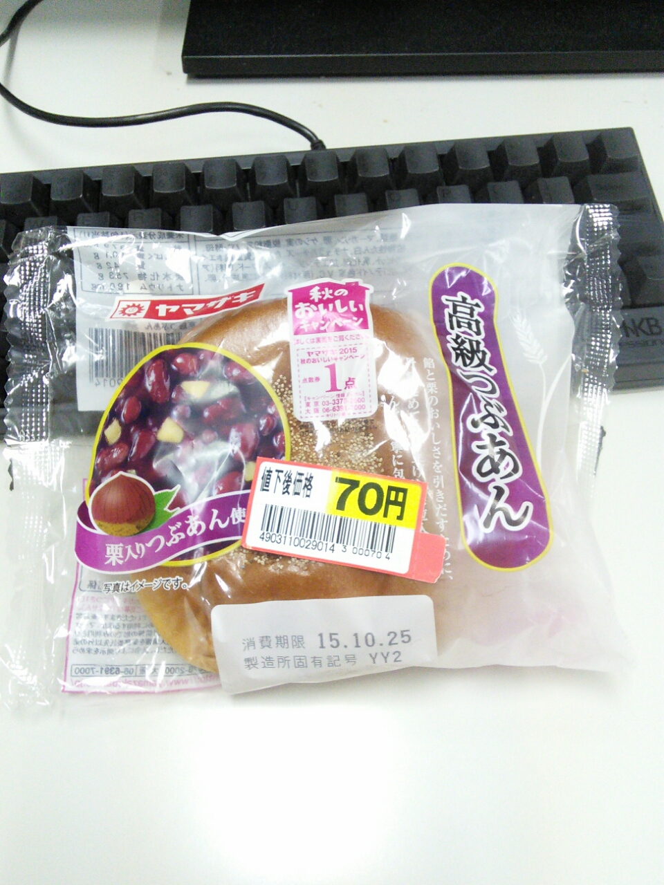 練習後の補食: アミノバイタルゴールド、ヤマザキ 高級つぶあん(379kcal,たん白質10.1g,脂質4.2g,炭水化物75.3g)。