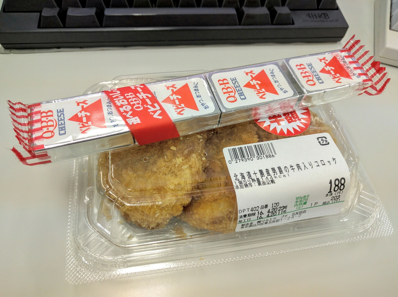 練習後の補食: QBB ベビーチーズ(200kcal,たん白質12g,脂質16.48g,炭水化物0.8g)、北海道十勝産男爵の牛肉入りコロッケ3こ(432kcal,たん白質5.9g,脂質27.6g,炭水化物38.7g)。