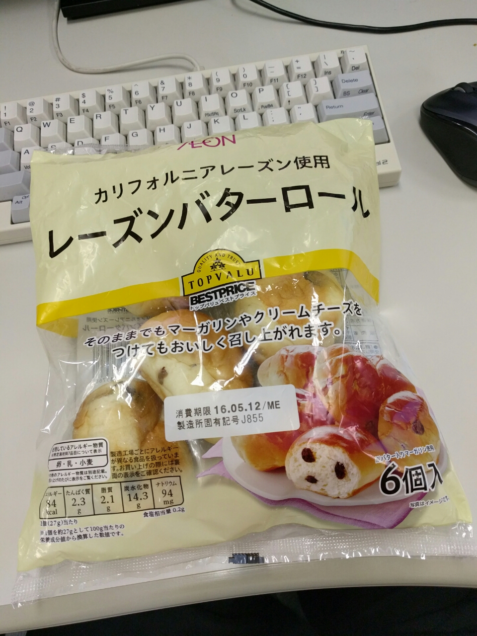 練習後の補食: レーズンバターロール(84kcal,たん白質2.3g,脂質2.1g,炭水化物13.7g *6)。