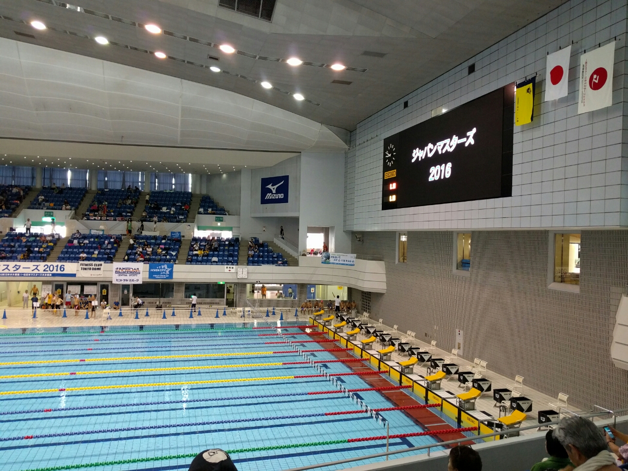 30分待って会場入り。観覧席はあんがい涼しい。室温27.5℃。さっそくメインプールでアップ。といっても400mくらいタラっと泳いだだけだが。水温はさほど冷たくは感じなかったが27℃。