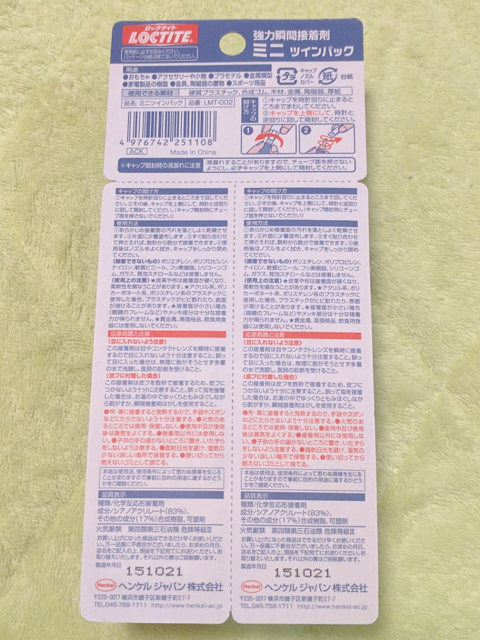 成分はシアノアクリレート83%+合成樹脂17%+可塑剤となっていて、どうやら樹脂を混ぜ込むことで染み込む素材に対応したり衝撃に強くしたりしてるっぽい。