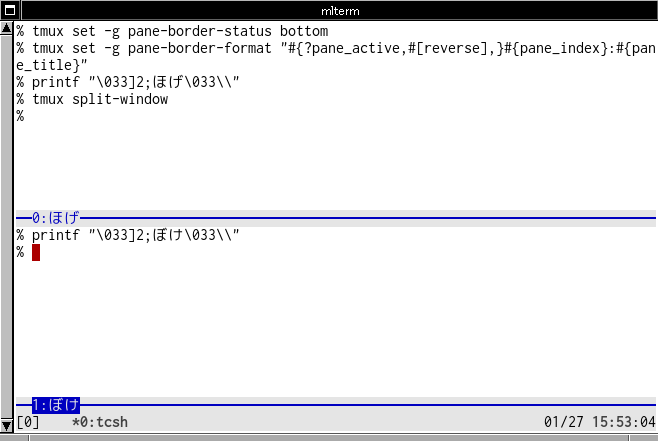 tmux2.3でpane-border-status/pane-border-formatが追加されてpane_titleが表示できるようになった。便利かもしれない。うっとおしいだけかもしれな。